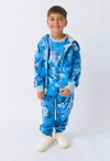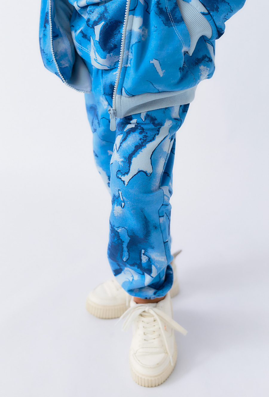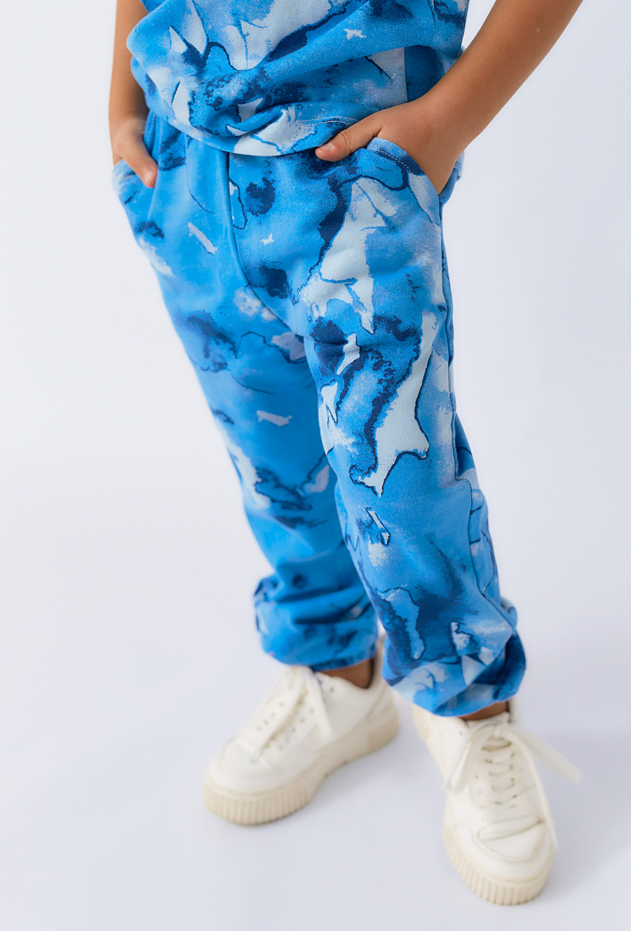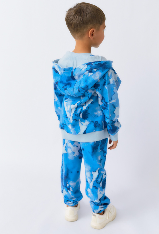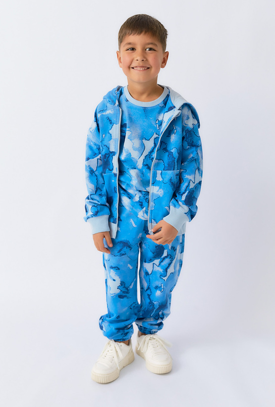 Wygodne i stylowe spodnie dresowe chłopięce z wyrazistym, niebieskim wzorem przypominającym moro to doskonały wybór dla aktywnych dzieci. Wykonane z naturalnej bawełny, zapewniają komfort noszenia przez cały dzień, zarówno w domu, jak i na zewnątrz. Elastyczny pas i ściągacze przy nogawkach gwarantują dopasowanie i wygodę ruchu. Spodnie świetnie sprawdzą się jako część sportowej stylizacji lub w zestawie z bluzą w tym samym wzorze.