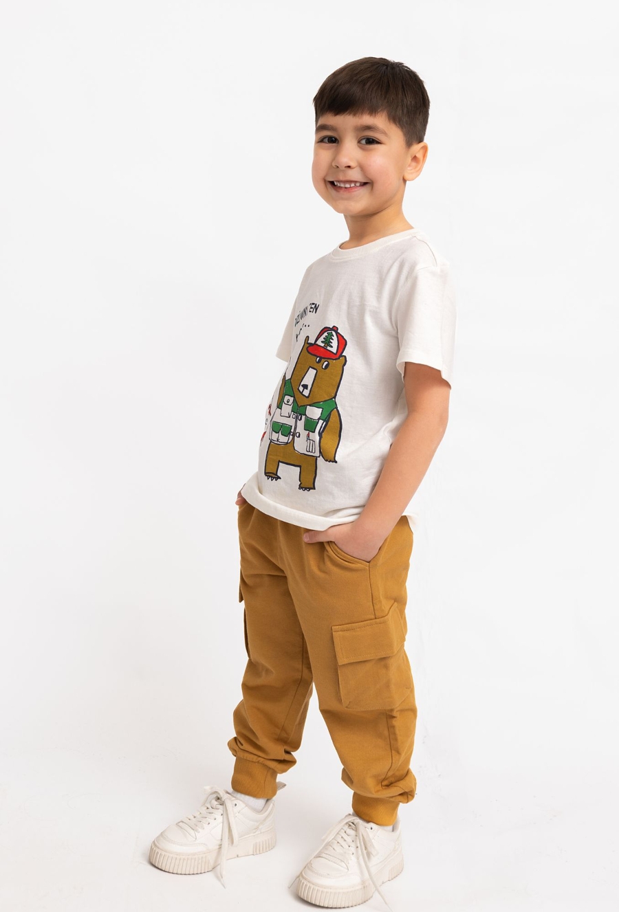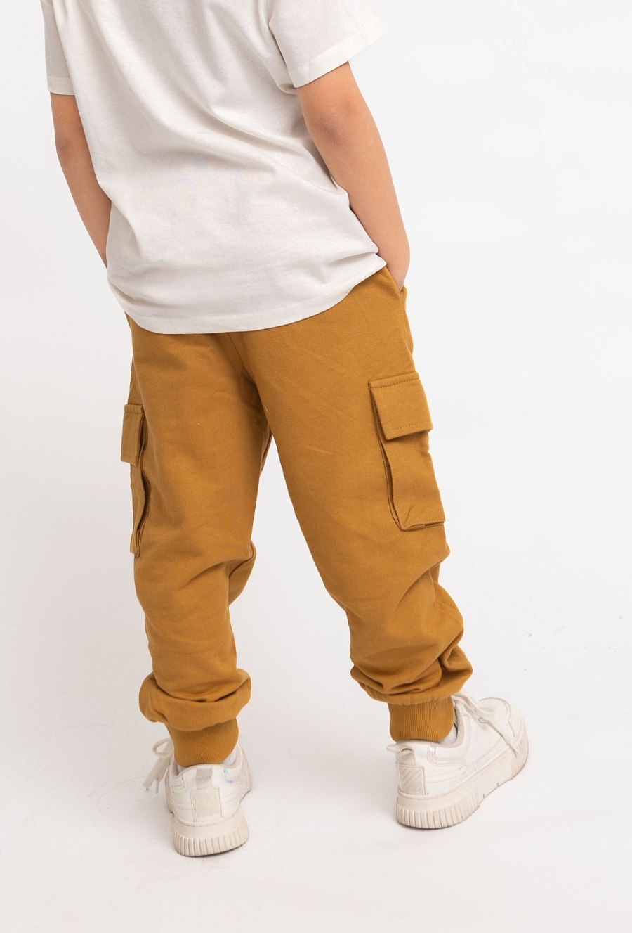 Brązowe spodnie dresowe cargo dla chłopca łączą wygodę dresów z praktycznym stylem bojówek. Uszyte w 100% z bawełny, komfortowe na cały dzień – do przedszkola, szkoły i na plac zabaw. Krój cargo z kieszeniami dodaje sportowego charakteru, a regulacja w pasie sznurkiem pozwala dopasować spodnie do sylwetki dziecka.