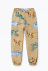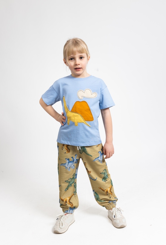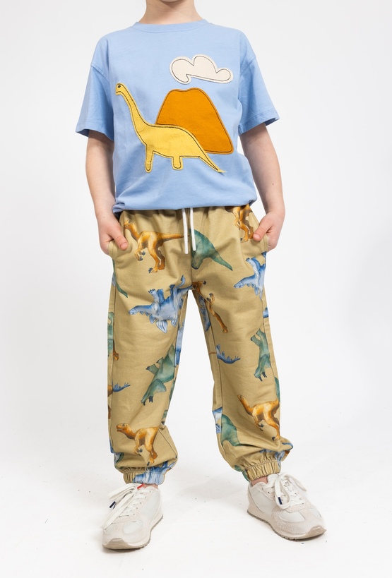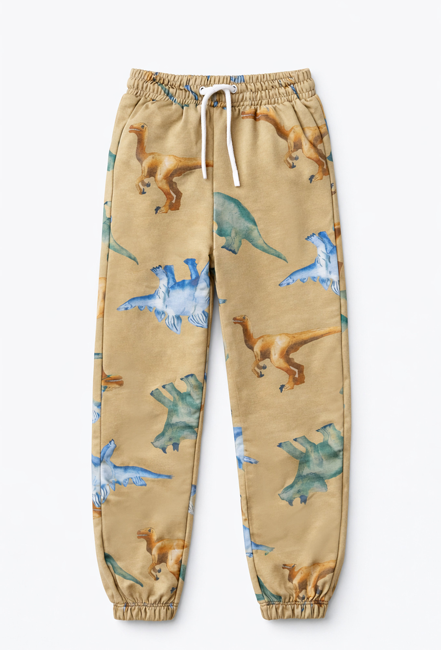 Spodnie dresowe dla chłopca z wyjątkowym, „malowanym” printem dinozaurów to idealny wybór dla małych fanów prehistorycznych przygód. Uszyte w 100% z bawełny z grubszej, mięsistej dzianiny, są ciepłe, miękkie i świetnie sprawdzają się na co dzień. Krój comfort zapewnia swobodę ruchów, a elastyczny pas i ściągacze u dołu nogawek trzymają wygodne dopasowanie. Doskonałe do kompletu z bluzą z tej samej serii.