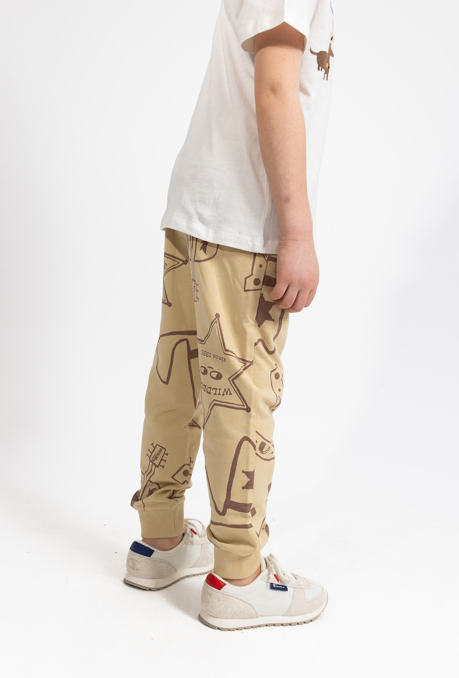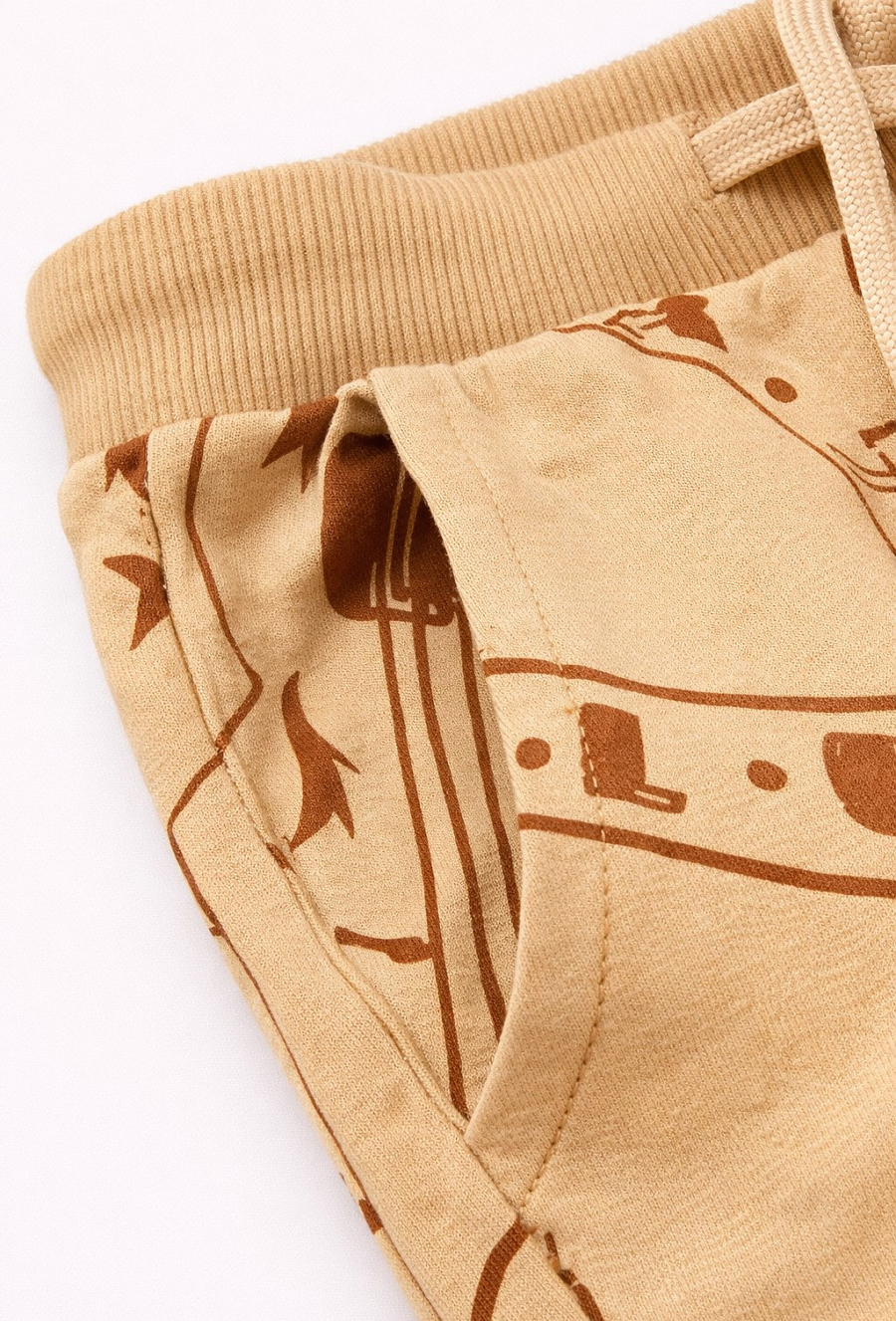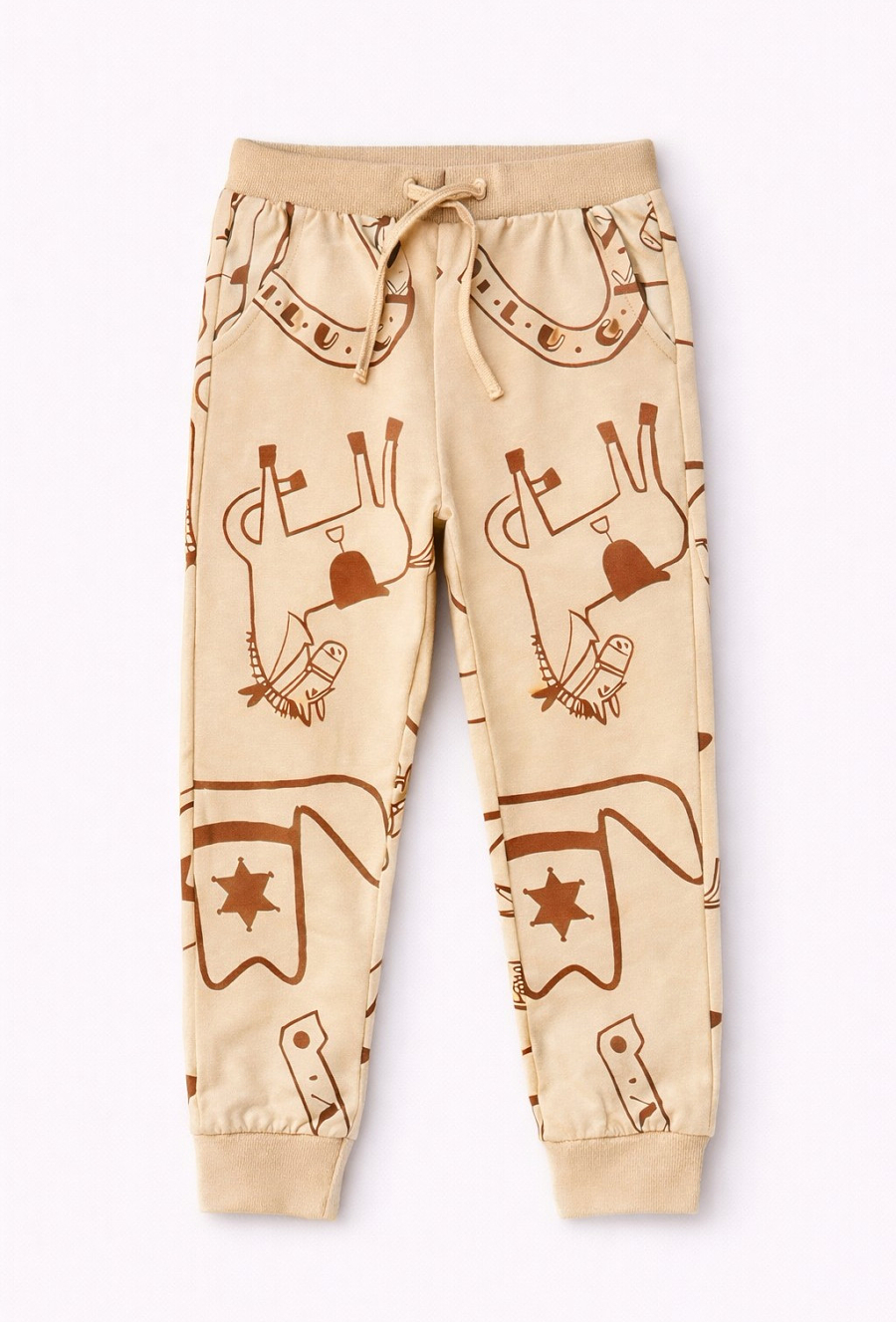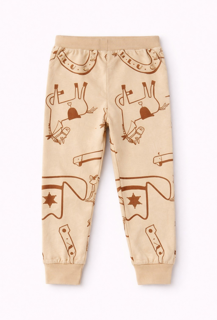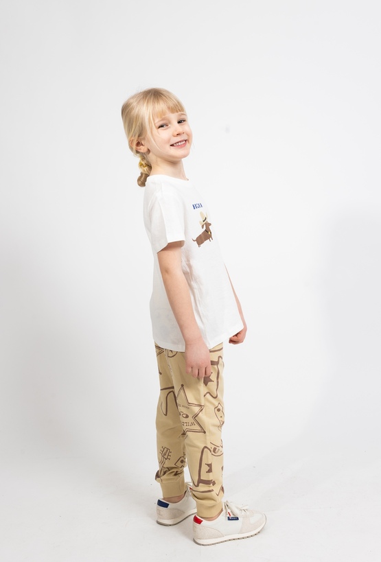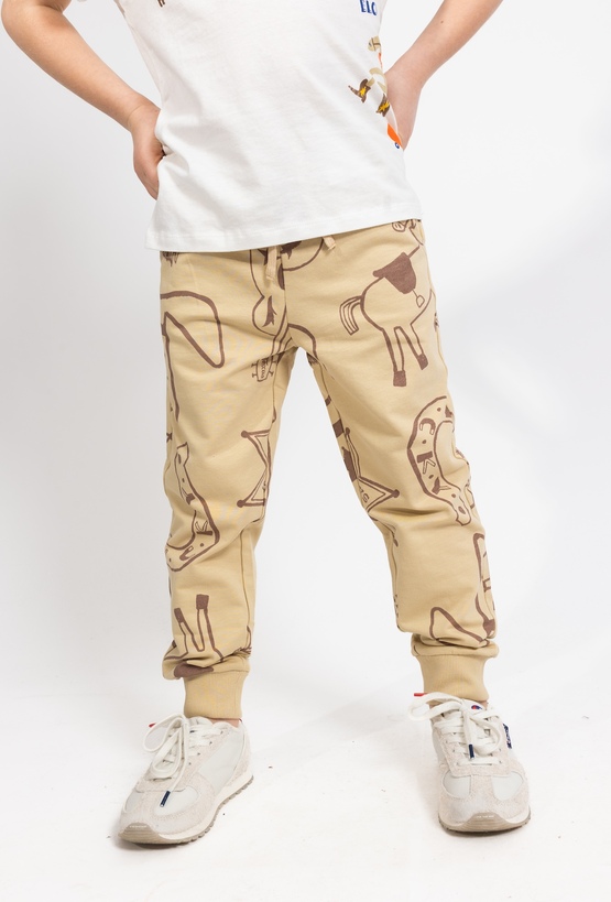 Komfort na co dzień w sportowym stylu. Beżowe spodnie dresowe 51015 w kroju slim dobrze układają się na sylwetce i zapewniają swobodę ruchów podczas zabawy, spacerów i aktywności. Wykonane z 100% bawełny są miękkie i przyjemne dla skóry. Regulacja w pasie sznurkiem pozwala łatwo dopasować spodnie do dziecka, a praktyczne wykończenie z nadrukiem w elementy z Dzikiego Zachodu sprawia, że to świetna baza do wielu zestawów.
