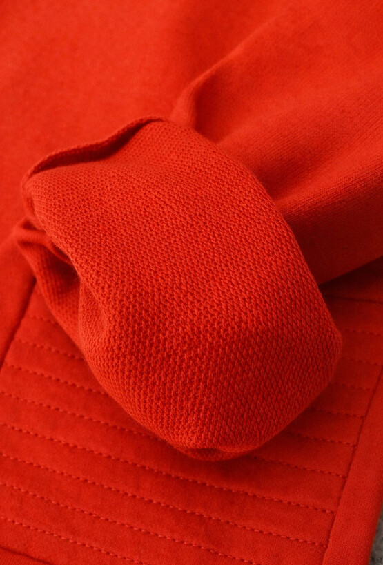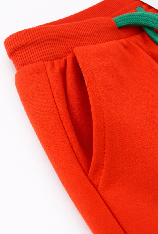 Pomarańczowe spodnie dresowe dla chłopca w kroju slim to wygodna opcja na aktywny dzień. Uszyte w 100% z bawełny, są miękkie i przyjemne w noszeniu. Wzmacniane kolana zwiększają trwałość podczas zabawy, a regulacja w pasie sznurkiem pozwala idealnie dopasować spodnie do sylwetki. Ściągacze przy nogawkach trzymają fason, a kieszenie po bokach dodają praktyczności.