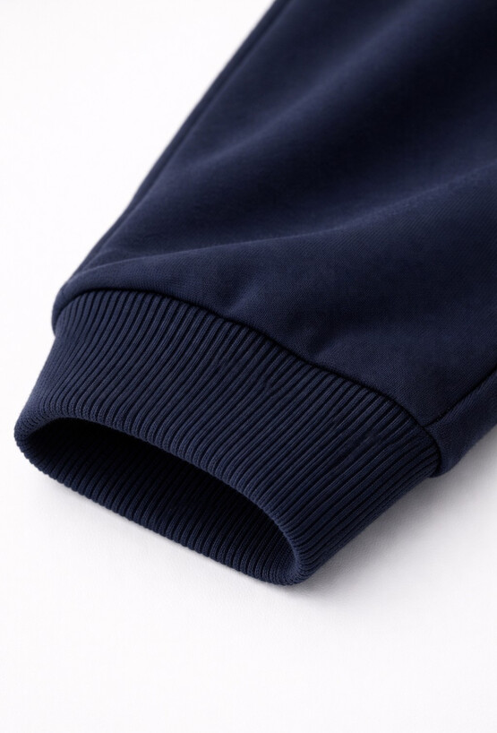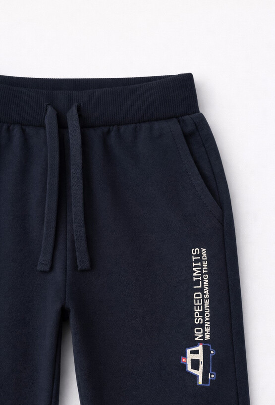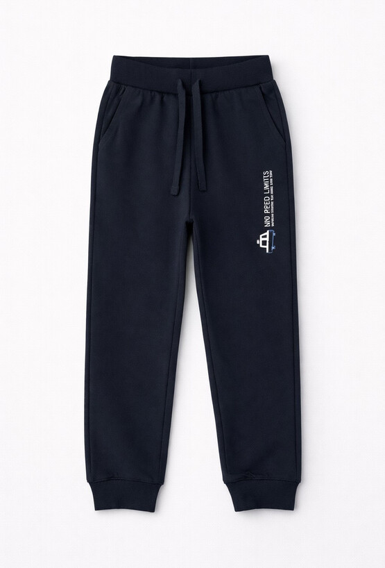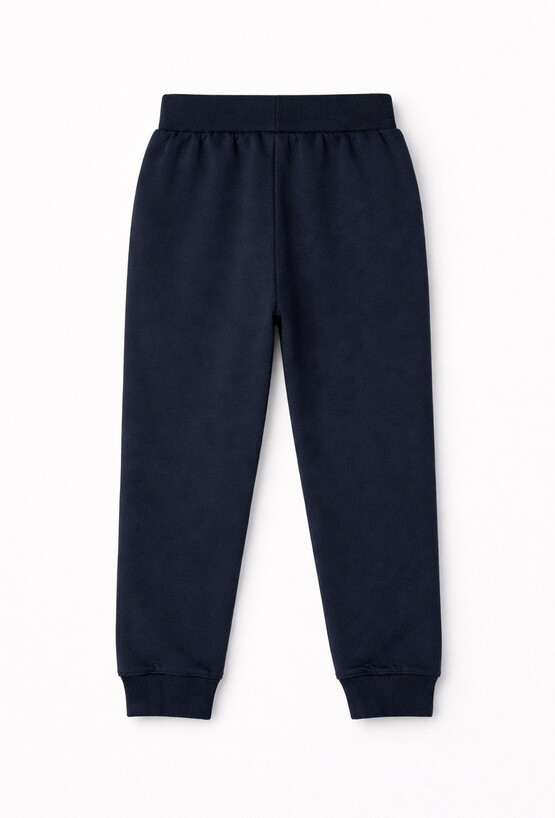 Granatowe spodnie dresowe dla chłopca w kroju slim to ponadczasowa klasyka do szkoły i na plac zabaw. Wykonane w 100% z bawełny, są miękkie i komfortowe w noszeniu. Regulacja w pasie sznurkiem ułatwia dopasowanie, a delikatny nadruk dodaje sportowego charakteru, nie przytłaczając stylizacji. Ściągacze przy nogawkach trzymają fason i zapewniają wygodę w ruchu.