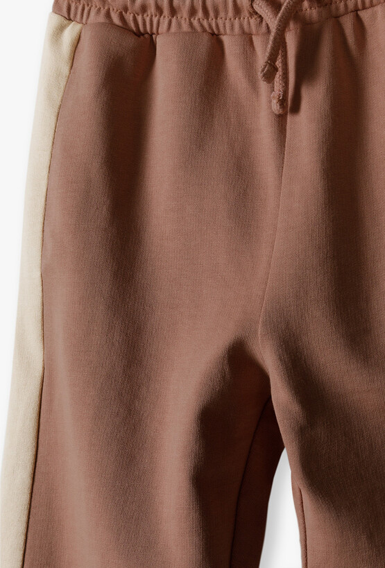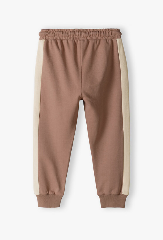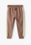 Joggery dresowe w kolorze ciepłego brązu – sportowa elegancja i wygoda. Szukasz spodni, które łączą w sobie luz dresów z modnym wyglądem? Te brązowe joggery to idealna propozycja dla małego chłopca, który potrzebuje swobody ruchów podczas zabawy, nie rezygnując przy tym ze stylowej prezentacji. Po bokach nogawek znajdują się szerokie, beżowe pasy (lampasy). Ten klasyczny, sportowy detal optycznie wysmukla sylwetkę i nadaje spodniom nowoczesnego, miejskiego charakteru. Brak kieszeni z tyłu oraz prosty krój gwarantują wygodę nawet podczas siedzenia czy drzemki. Ciepły brąz w połączeniu z beżem to bardzo uniwersalna baza – spodnie świetnie wyglądają z kremowym longsleevem, białą koszulką bez rękawów czy dopasowaną bluzą.