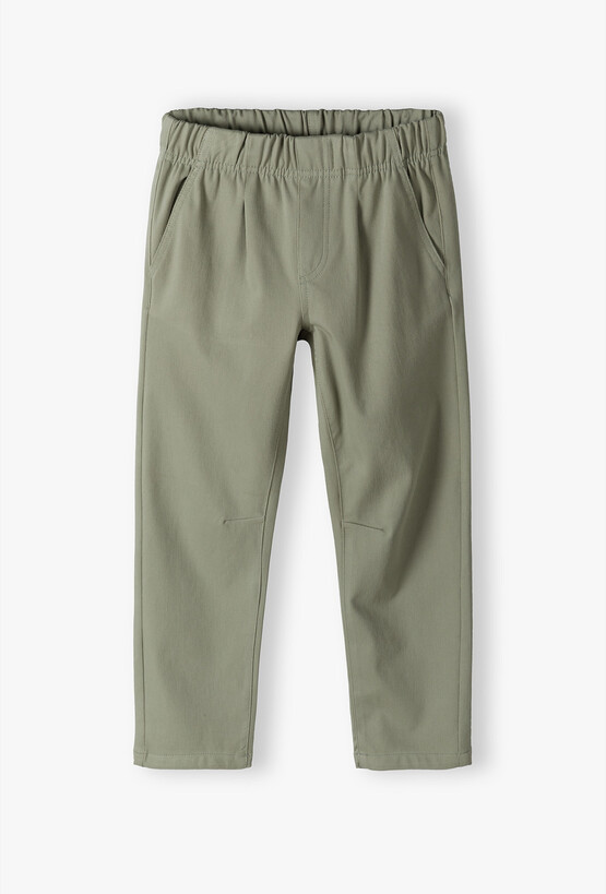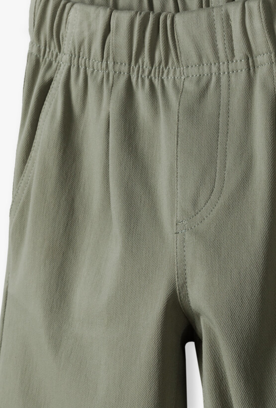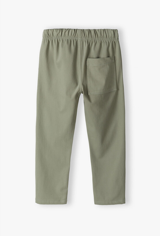 Klasyczne spodnie chłopięce w kolorze szałwiowym – elegancja i wygoda. Postaw na ponadczasowy styl z nutą nowoczesności. Te klasyczne spodnie typu chino w modnym odcieniu zgaszonej, szałwiowej zieleni to idealny wybór dla małego chłopca na okazje wymagające eleganckiego, a zarazem swobodnego stroju. Spodnie łączą elegancki wygląd z wygodą dresów. Szeroka, elastyczna guma w pasie zapewnia idealne dopasowanie do sylwetki dziecka, nie krępując ruchów podczas aktywnej zabawy. Specjalne przeszycia na wysokości kolan zapobiegają wypychaniu się materiału, dzięki czemu spodnie zachowują swój nienaganny kształt przez długi czas. Te spodnie to fundament garderoby każdego małego dżentelmena – idealne na rodzinne obiady, święta czy urodziny kolegi.