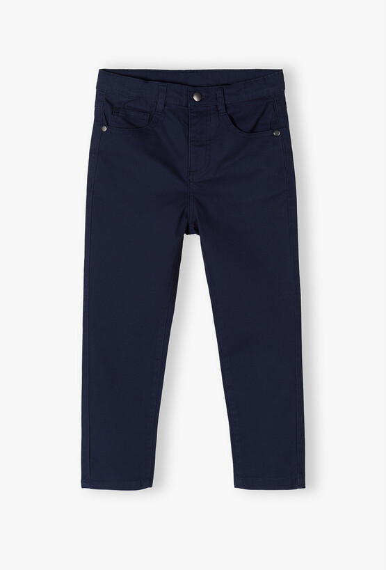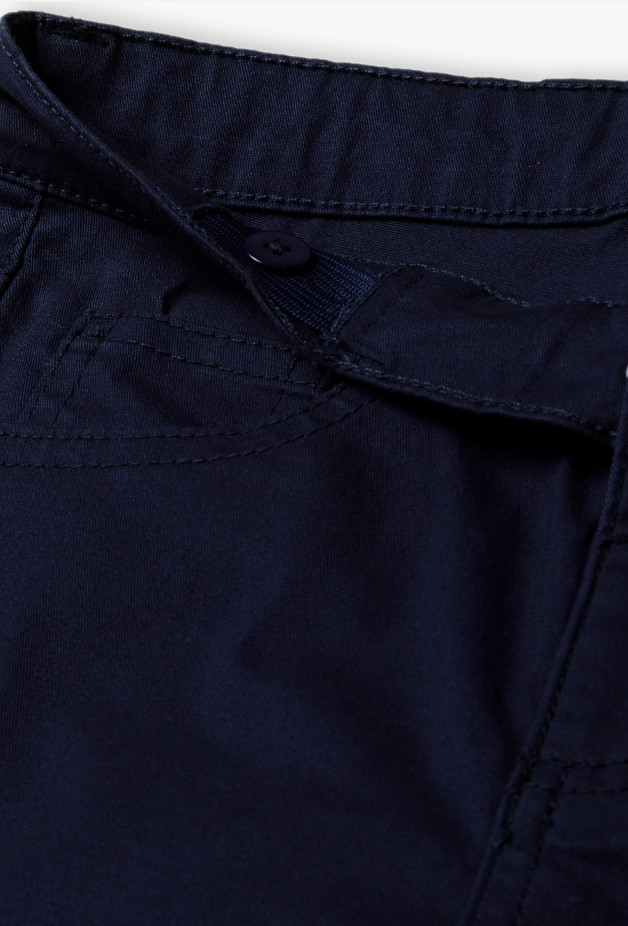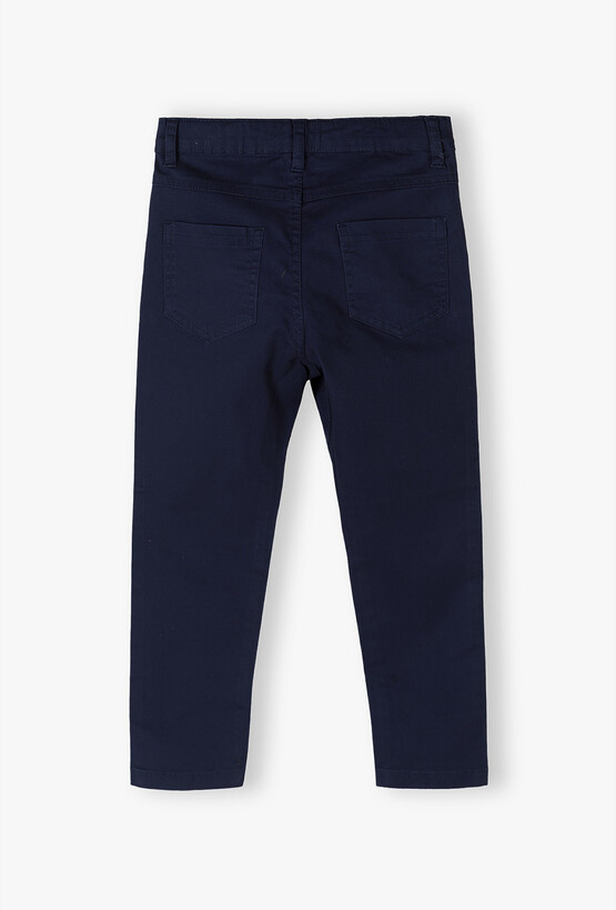 Postaw na ponadczasową elegancję w wydaniu comfort! Te granatowe spodnie o kroju chino to fundament garderoby każdego małego odkrywcy. Zostały zaprojektowane tak, aby prezentować się nienagannie podczas rodzinnych uroczystości, a jednocześnie zapewniać pełną swobodę ruchów podczas codziennych przygód w przedszkolu. Dzięki ukrytej gumce z guzikami po wewnętrznej stronie paska, możesz idealnie dopasować szerokość spodni do sylwetki dziecka. To sprawia, że spodnie „rosną” razem z maluchem i zawsze leżą idealnie. Solidne przeszycia, nity przy przednich kieszeniach oraz dbałość o wykończenie nogawek gwarantują, że spodnie zachowają swój fason nawet po wielu praniach.