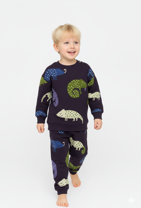 Komplet dresowy dla małego chłopca, składający się z bluzy i spodni z zabawnym nadrukiem kolorowych kameleonów. Luźny fason zapewnia komfort noszenia, a elastyczne ściągacze utrzymują ubranie na miejscu. Wygodna propozycja na co dzień – do zabawy w domu lub spacerów w chłodniejsze dni.