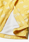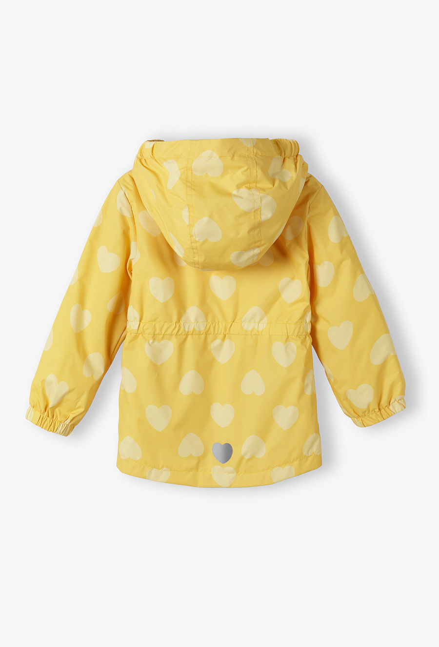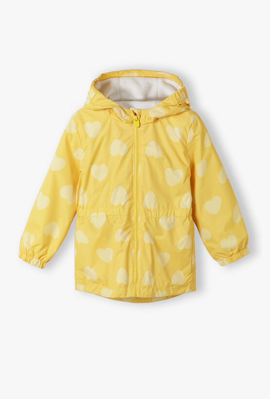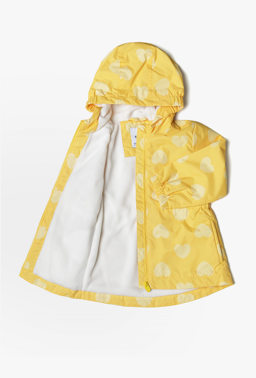 Rozświetl garderobę swojej córeczki na wiosnę! Ta intensywnie żółta kurtka to połączenie nowoczesnego stylu z funkcjonalnością, której potrzebuje Twój maluszek podczas zmiennej, przejściowej aury. Skutecznie chroni przed wiatrem i lekkim chłodem, dodając energii każdemu wspólnemu spacerowi. Cała powierzchnia kurtki została ozdobiona dużymi, jasnymi sercami. Ten uroczy motyw sprawia, że kurtka prezentuje się niezwykle dziewczęco i modnie. Kurtka oraz kaptur posiadają miękką, białą podszewkę z polaru. Zapewnia ona przyjemne ciepło i miękkość, będąc jednocześnie materiałem oddychającym, idealnym dla niemowląt. Z tyłu kurtki znajduje się subtelny element odblaskowy w kształcie serca, który poprawia widoczność podczas spacerów po zmroku.