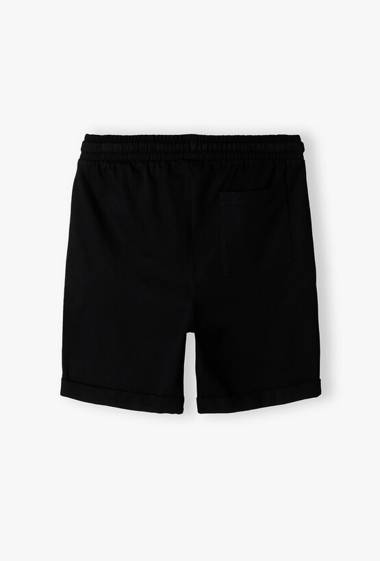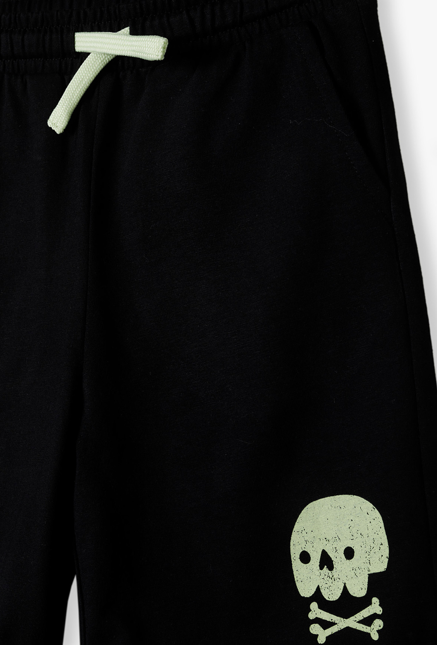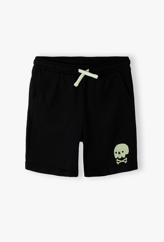 Dodaj charakteru letniej garderobie swojego synka! Te czarne szorty dresowe to idealne połączenie buntowniczego stylu z komfortem, którego potrzebuje każdy aktywny maluch. Miękka dzianina i modne detale sprawiają, że spodenki świetnie sprawdzą się podczas wakacyjnych wyjazdów, zabaw na podwórku czy w przedszkolu. Na dole lewej nogawki znajduje się przyciągający wzrok nadruk czaszki z piszczelami w kontrastowym, miętowym kolorze. Grafika ma modny efekt „postarzenia”, co nadaje spodenkom unikalnego wyglądu. Szeroka, elastyczna guma została uzupełniona o miętowy sznurek do regulacji. Pozwala on na idealne dopasowanie szortów do talii dziecka, zapobiegając ich zsuwaniu się podczas biegania.