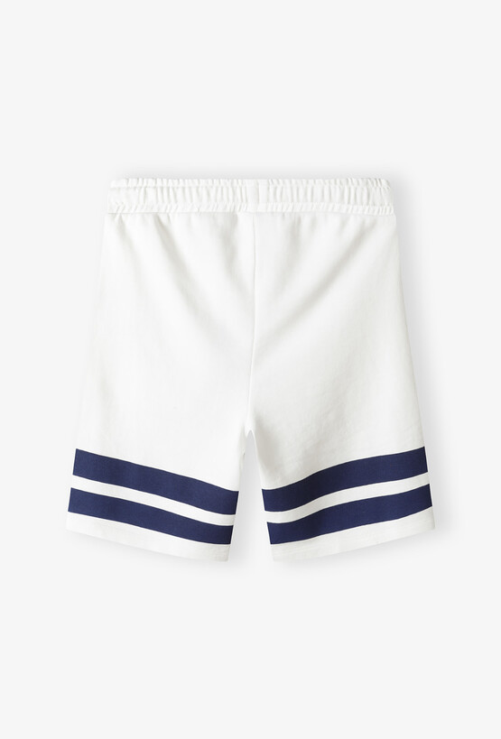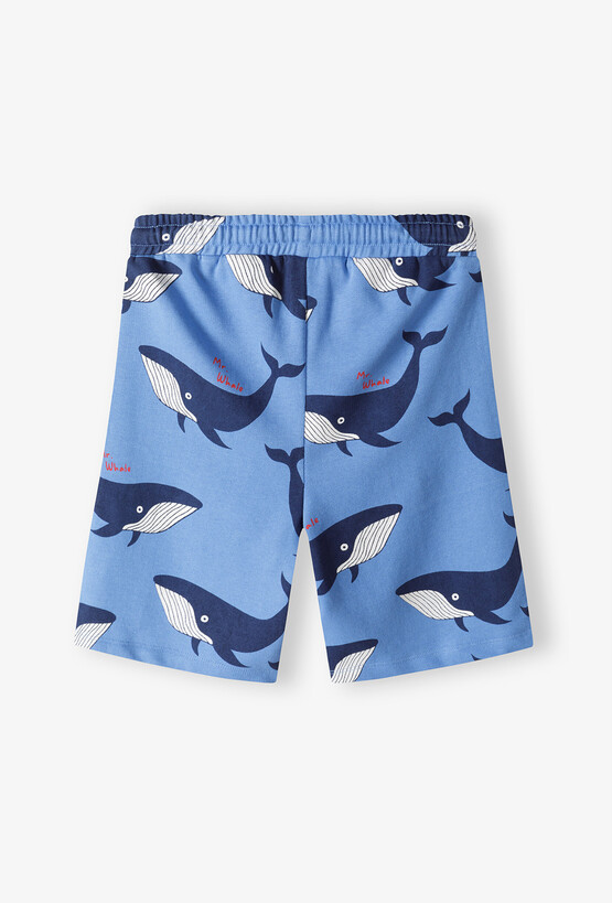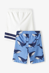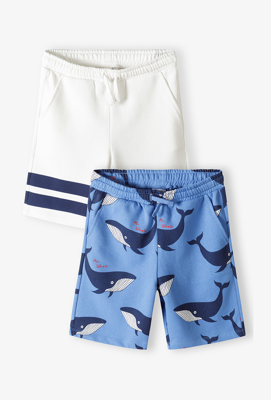 Przygotuj swojego synka na wakacyjne przygody nad wodą i nie tylko! Ten praktyczny zestaw zawiera dwie pary szortów dresowych, które łączą radosny, dziecięcy design z maksymalną wygodą. Miękka dzianina i swobodny krój sprawiają, że spodenki te będą ulubionym wyborem na każdy słoneczny dzień. Klasyczne białe szorty z dwoma kontrastowymi, granatowymi pasami na dole nogawki, nawiązujące do modnego stylu sportowego i marynarskiego. Spodenki w kolorze jasnego błękitu ozdobione nadrukiem radosnych wielorybów z napisem „Mr. Whale”. Idealne dla małego miłośnika morskich głębin. Elastyczna guma w pasie została uzupełniona o praktyczne troczki, co pozwala na idealne dopasowanie spodenek do sylwetki dziecka i zapobiega ich zsuwaniu się. Obie pary wyposażone są w boczne kieszenie, w których maluch może schować swoje wakacyjne znaleziska.
