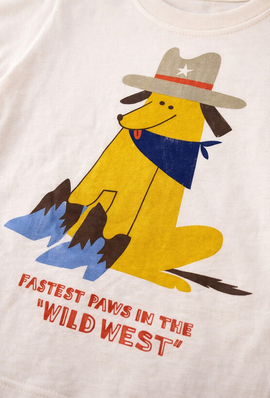 Nasza koszulka w odcieniu ecru to idealna baza dla każdego małego odkrywcy. Ten T-shirt łączy w sobie dziecięcą radość płynącą z zabawnego nadruku z bezkompromisową dbałością o jakość, której oczekuje każdy rodzic. Delikatny, kremowy kolor ecru stanowi doskonałe tło dla wyrazistej grafiki przedstawiającej uroczego pieska w stroju szeryfa, który z pewnością skradnie serce Twojego dziecka i stanie się ulubionym elementem codziennych stylizacji.