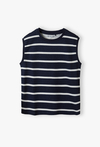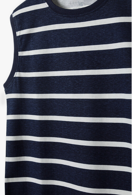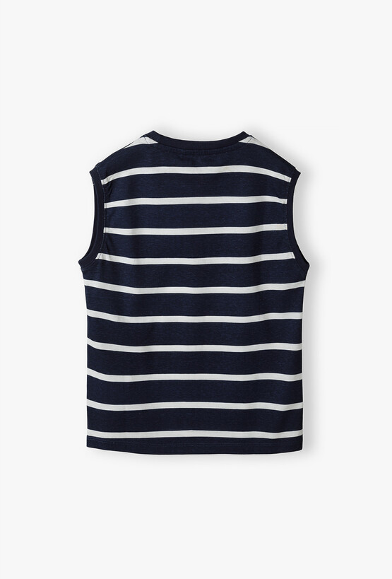 Postaw na ponadczasowy styl, który nigdy nie wychodzi z mody! Ta granatowa koszulka bez rękawów w białe pasy to idealny wybór dla każdego małego fana morskich przygód. Zapewnia nie tylko stylowy wygląd, ale przede wszystkim maksymalny komfort podczas najbardziej upalnych dni. Połączenie głębokiego granatu z czystą bielą w formie poziomych pasów to klasyka, która świetnie komponuje się z niemal każdym elementem dziecięcej garderoby.