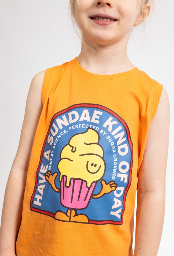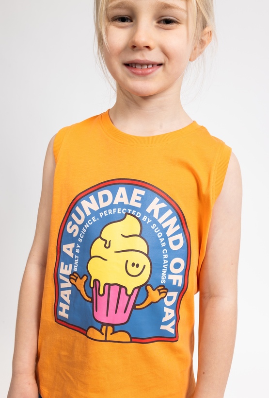 Wprowadź wakacyjną energię do szafy swojego dziecka dzięki tej wyrazistej koszulce. Intensywny, pomarańczowy odcień w połączeniu z radosną grafiką sprawia, że jest to idealny wybór na letnie dni pełne zabawy. Centralną część koszulki zajmuje duża, kolorowa grafika przedstawiająca uśmiechniętą babeczkę w różowej papilotce na tle niebieskiego łuku. Napis „HAVE A SUNDAE KIND OF DAY” dodaje całości pozytywnego charakteru.