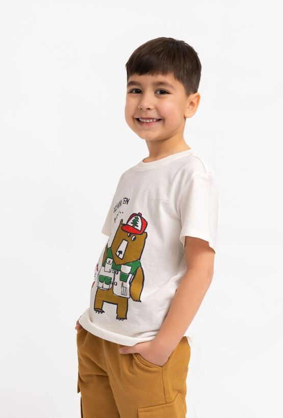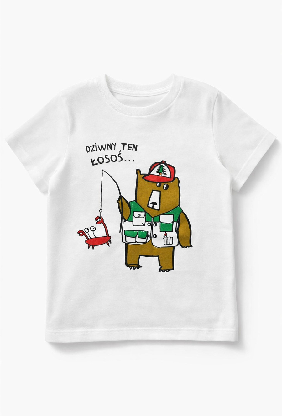 Lekka koszulka dla chłopca w kolorze ecru z humorystycznym nadrukiem misia wędkarza i napisem „Dziwny ten łosoś…”. Uszyta w 100% z bawełny – miękka, przyjemna dla skóry i idealna na codzienne aktywności. Klasyczny krój zapewnia swobodę ruchów, a uniwersalny kolor łatwo dopasujesz do szortów, jeansów czy dresów.