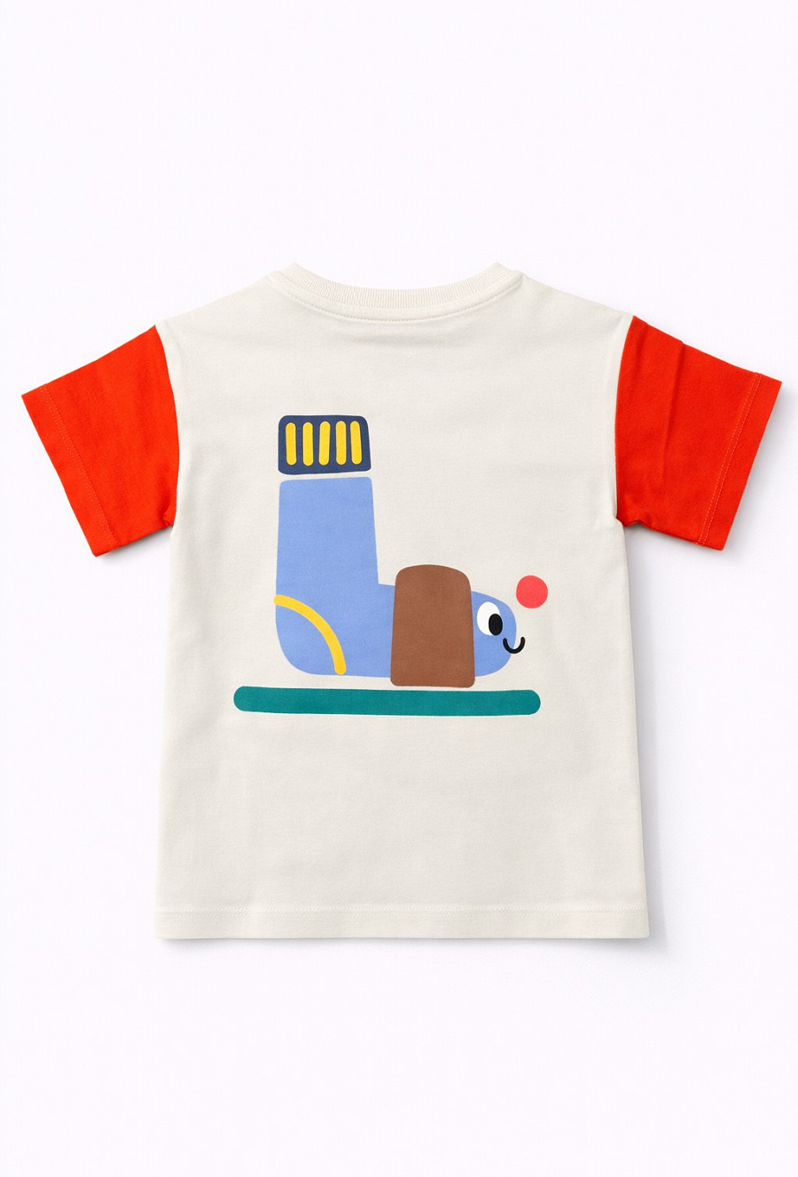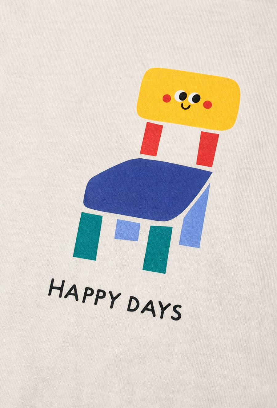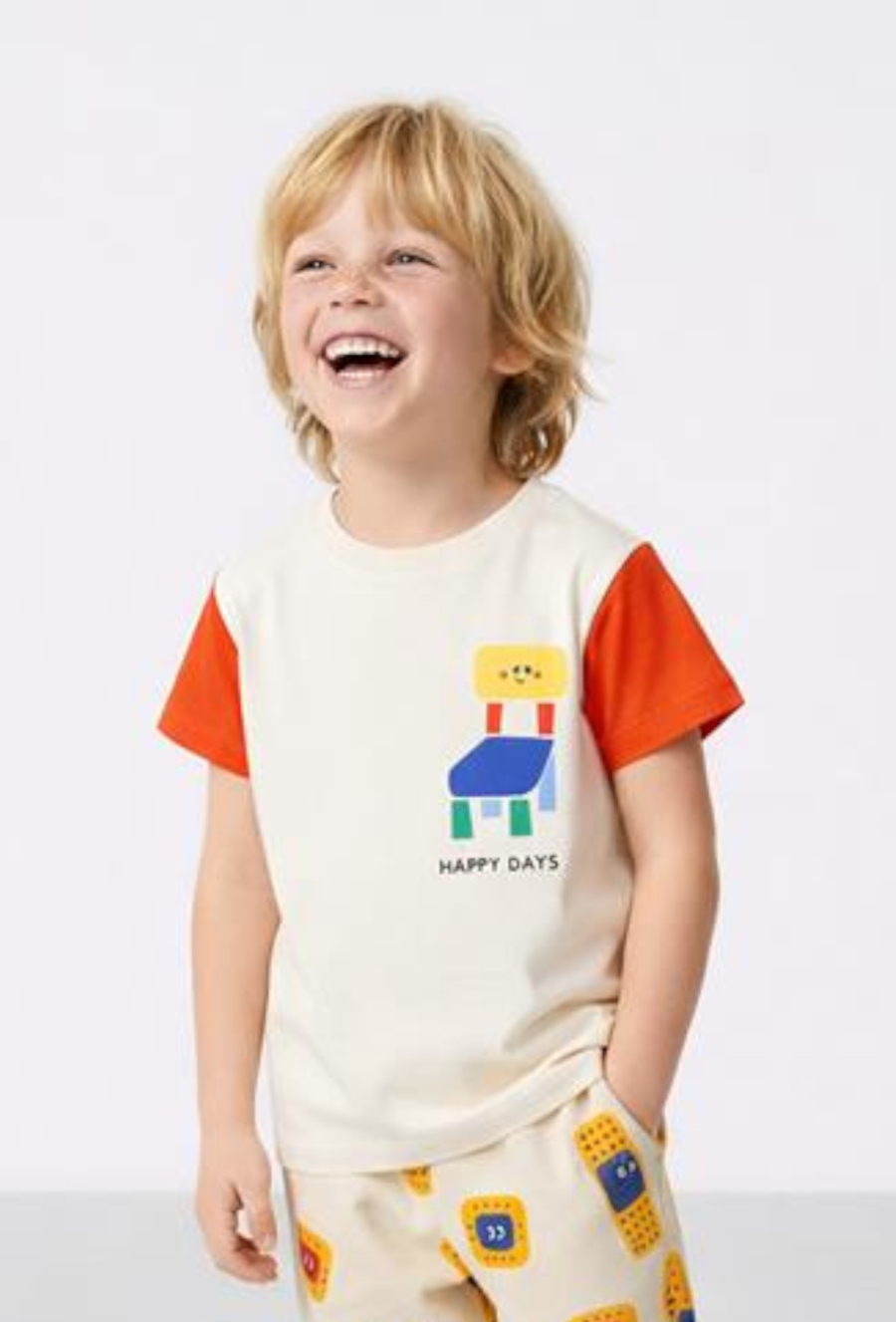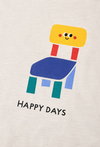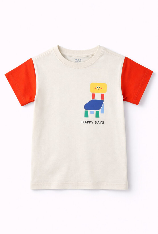 Wygodny T-shirt dla chłopca w kolorze ecru, uszyty w 100% z miękkiej bawełny. Kontrastowe rękawy dodają mu sportowego charakteru, a wesołe nadruki sprawiają, że koszulka od razu wpada w oko. Z przodu znajduje się mniejszy print z napisem „HAPPY DAYS”, a na plecach duży, kolorowy nadruk – idealny na co dzień, do szkoły i na plac zabaw.