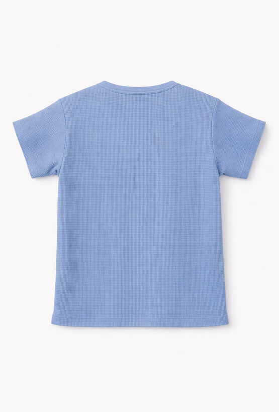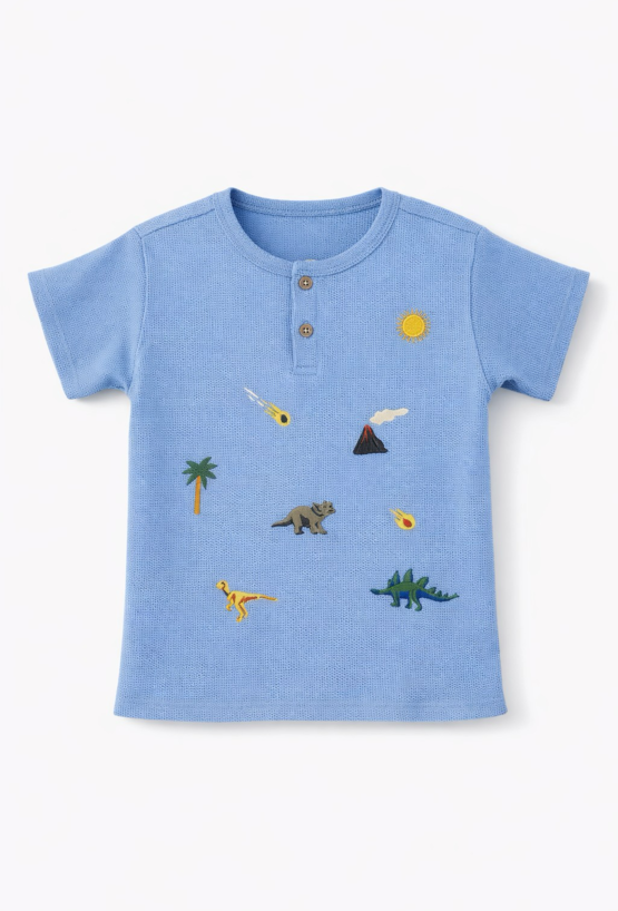 Niebieska koszulka dla chłopca uszyta z przyjemnej w dotyku, strukturalnej dzianiny typu waffle. Luźniejszy krój comfort zapewnia swobodę ruchów, a dodatek elastanu sprawia, że materiał dobrze pracuje i dopasowuje się do sylwetki. Z przodu zapięcie na guziki oraz haftowane motywy dinozaurów, które dodają całości charakteru. Idealna na co dzień – do szortów, jeansów i dresów.