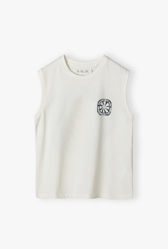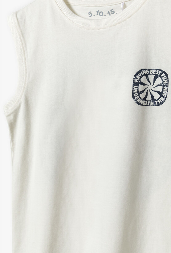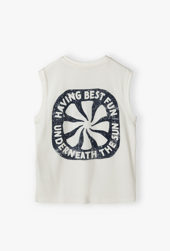 Bezrękawnik „Having Best Fun” – swoboda i wakacyjny styl w kolorze ecru. Przygotuj swojego malucha na największe letnie upały! Ta koszulka bez rękawów w odcieniu delikatnego kremu to połączenie maksymalnej przewiewności z modnym, surferskim designem. Idealna na plażę, plac zabaw czy wakacyjne wycieczki. Przód koszulki zdobi mały, czarny logotyp w stylu vintage, natomiast na plecach znajduje się jego powiększona wersja. Napis „Having Best Fun Underneath The Sun” otaczający grafikę słońca/wiatraka podkreśla wakacyjny klimat stylizacji.