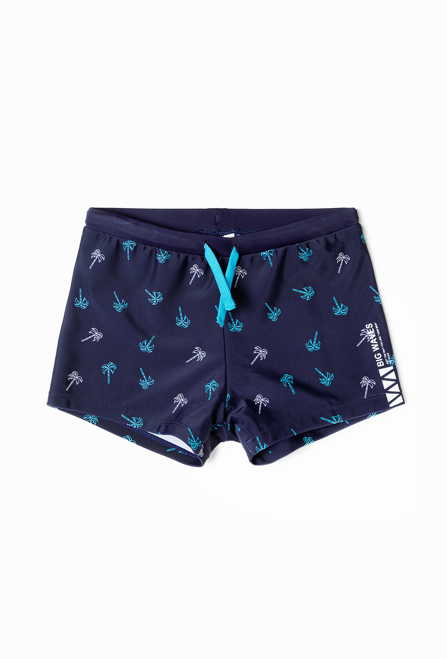 Przygotuj się na wodne szaleństwo w najlepszym stylu! Te granatowe boksery kąpielowe to idealny wybór dla aktywnych chłopców, którzy kochają spędzać czas nad wodą. Łączą w sobie nowoczesny, surferski design z funkcjonalnością, zapewniając pełną swobodę ruchów podczas pływania, skakania do wody czy gry w siatkówkę plażową. Ciemnogranatowe tło zostało ożywione gęstym nadrukiem błękitnych i białych palm. To klasyczny, wakacyjny motyw, który wyróżnia się na tle jednokolorowych strojów kąpielowych. Elastyczny pas został uzupełniony o wyrazisty, jaskrawoniebieski sznurek do regulacji. Dzięki temu kąpielówki stabilnie trzymają się na sylwetce i nie zsuwają się nawet podczas najbardziej dynamicznych zabaw w wodzie. Na boku nogawki umieszczono modny napis „BIG WAVES”, który podkreśla sportowy charakter stroju.