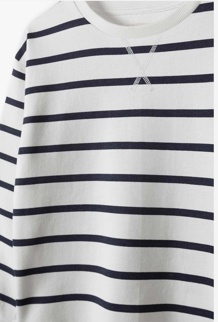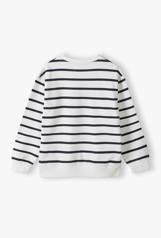 Postaw na styl, który nigdy nie wychodzi z mody! Ta biała bluza w regularne, granatowe paski to idealne połączenie marynarskiej klasyki z nowoczesnym, sportowym komfortem. Dzięki uniwersalnej kolorystyce i dopracowanym detalom, bluza ta stanie się ulubionym elementem codziennej garderoby każdego chłopca. Wyraziste, poziome pasy w kolorze ciemnego granatu na białym tle nadają bluzie świeżego i schludnego wyglądu. To wzór, który doskonale komponuje się zarówno z klasycznymi jeansami, jak i spodniami dresowymi. Bluza posiada okrągły dekolt wykończony prążkowanym ściągaczem typu stójka. Charakterystyczne przeszycie w kształcie litery „X” pod dekoltem nawiązuje do klasycznego stylu bluz sportowych typu sweatshirt. Ta bluza to idealna baza do tworzenia warstwowych stylizacji – świetnie wygląda założona na biały T-shirt lub pod granatową bluzę.