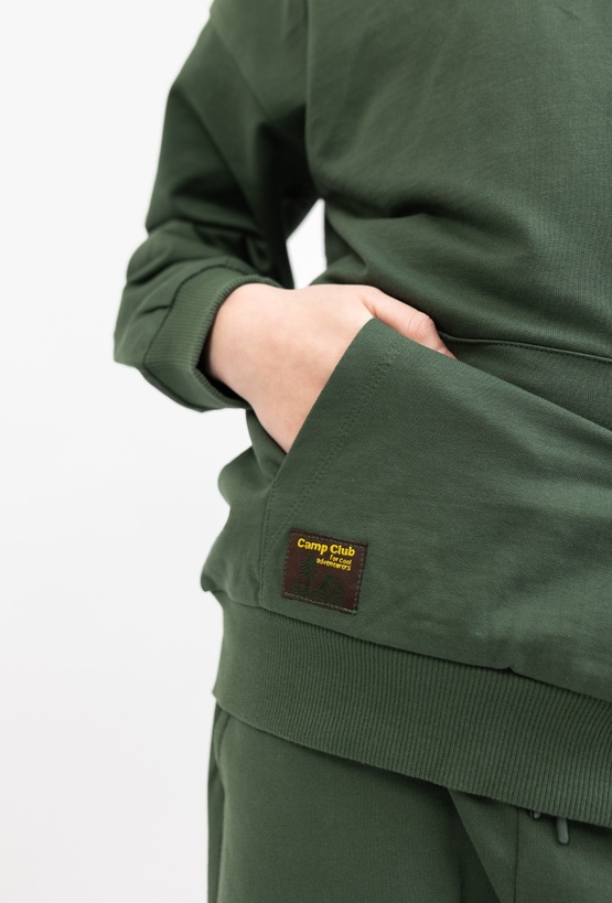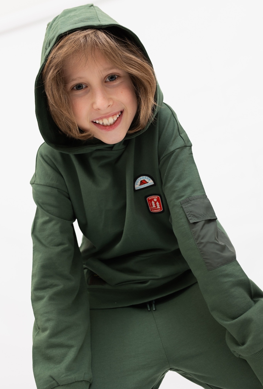 Zielona bluza kangurka to wygodny wybór na chłodniejsze dni — idealna do szkoły, na podwórko i weekendowe wyjazdy. Uszyta z grubszej, mięsistej dzianiny (100% bawełna), otula ciepłem i zapewnia komfort w ruchu. Model wyróżniają dopracowane detale: naszywki w klimacie outdoor oraz praktyczna kieszonka na rękawie z technicznego materiału, która dodaje sportowego charakteru. Klasyczna kieszeń kangurka sprawdzi się na drobiazgi i ogrzanie dłoni, a kaptur świetnie dopełnia całość.