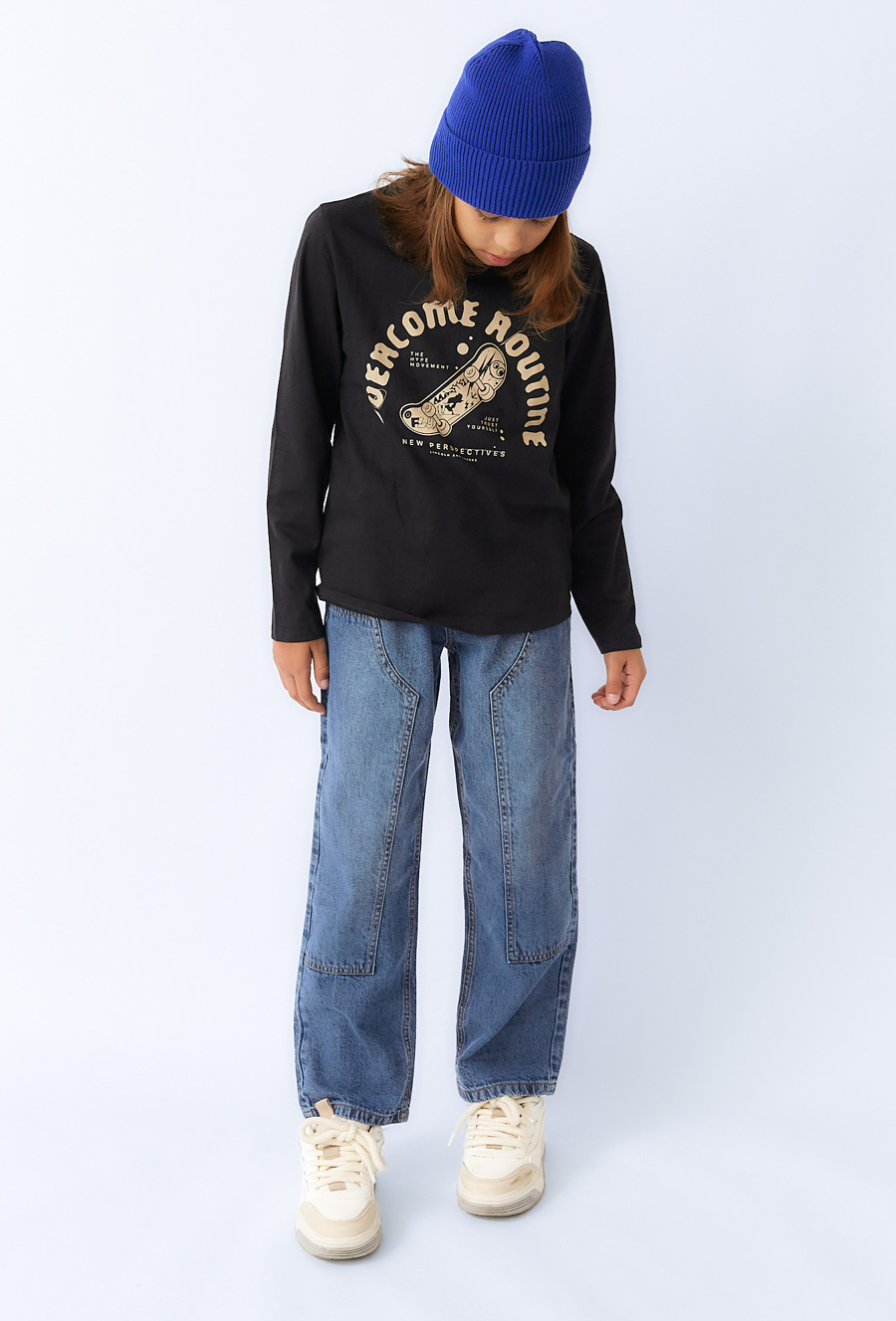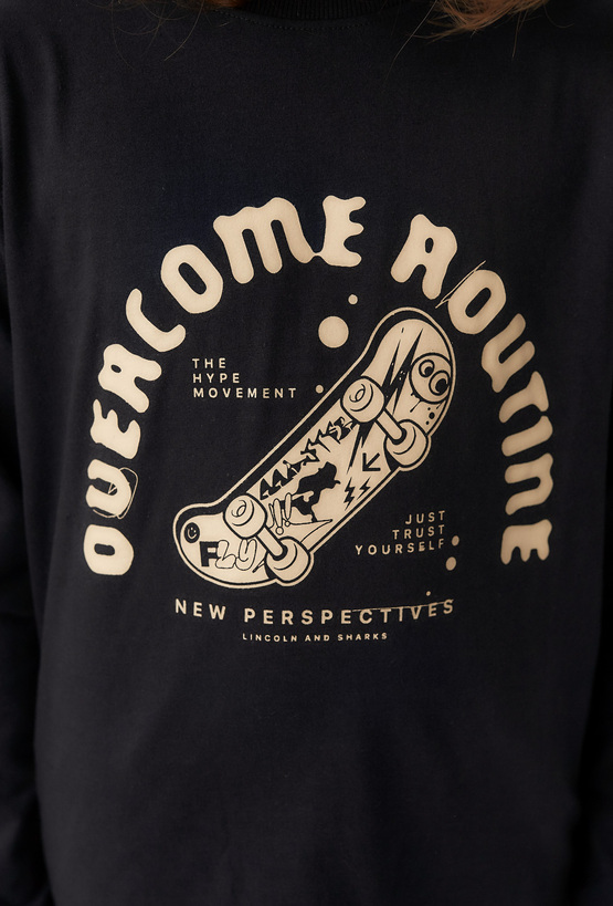Czarna bluzka chłopięca z długim rękawem to propozycja dla młodych miłośników miejskiego stylu. Wykonana w 100% z wysokiej jakości bawełny, jest miękka, przewiewna i komfortowa w noszeniu. Na przodzie znajduje się wyrazisty nadruk z motywem deskorolki i napisem “Overcome Routine”, który doskonale wpisuje się w klimat streetwear i skate. Klasyczny krój z okrągłym dekoltem zapewnia wygodę i swobodę ruchów. Idealna do codziennych stylizacji – modna, wygodna i w duchu miejskiego luzu.