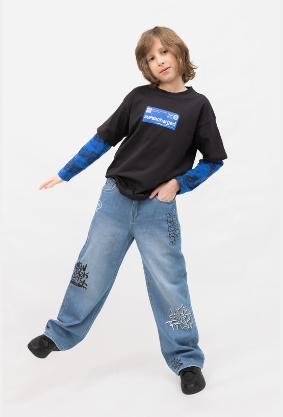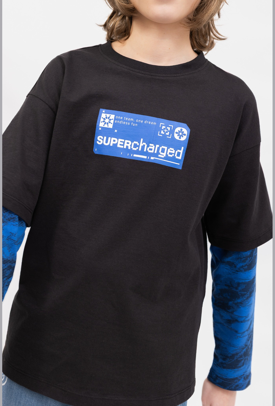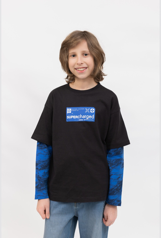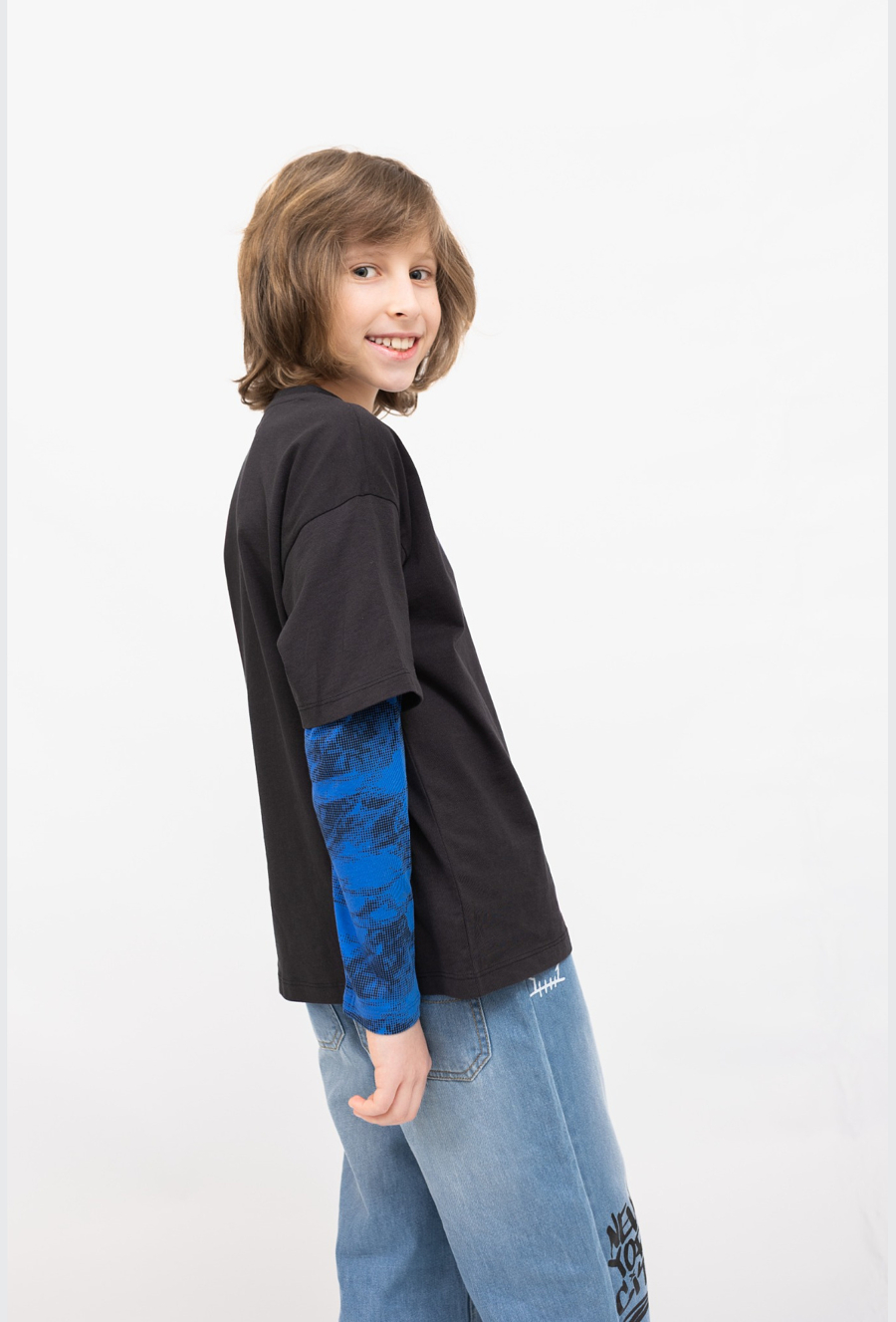 Czarna bluzka z długim rękawem dla chłopca to wygodna propozycja na sezon przejściowy i chłodniejsze dni. Model ma efekt 2w1 – krótszy, czarny rękaw oraz dwuwarstwowe, kontrastowe rękawy w intensywnym kolorze, które wyglądają jak założona pod spód druga koszulka. Całość uzupełniają printy z motywem pixeli, które dodają stylizacji nowoczesnego, streetwearowego charakteru. Uszyta z 100% bawełny, bluzka jest miękka, przewiewna i komfortowa, a regularny krój zapewnia swobodę ruchów w szkole, na spacerze i podczas zabawy.