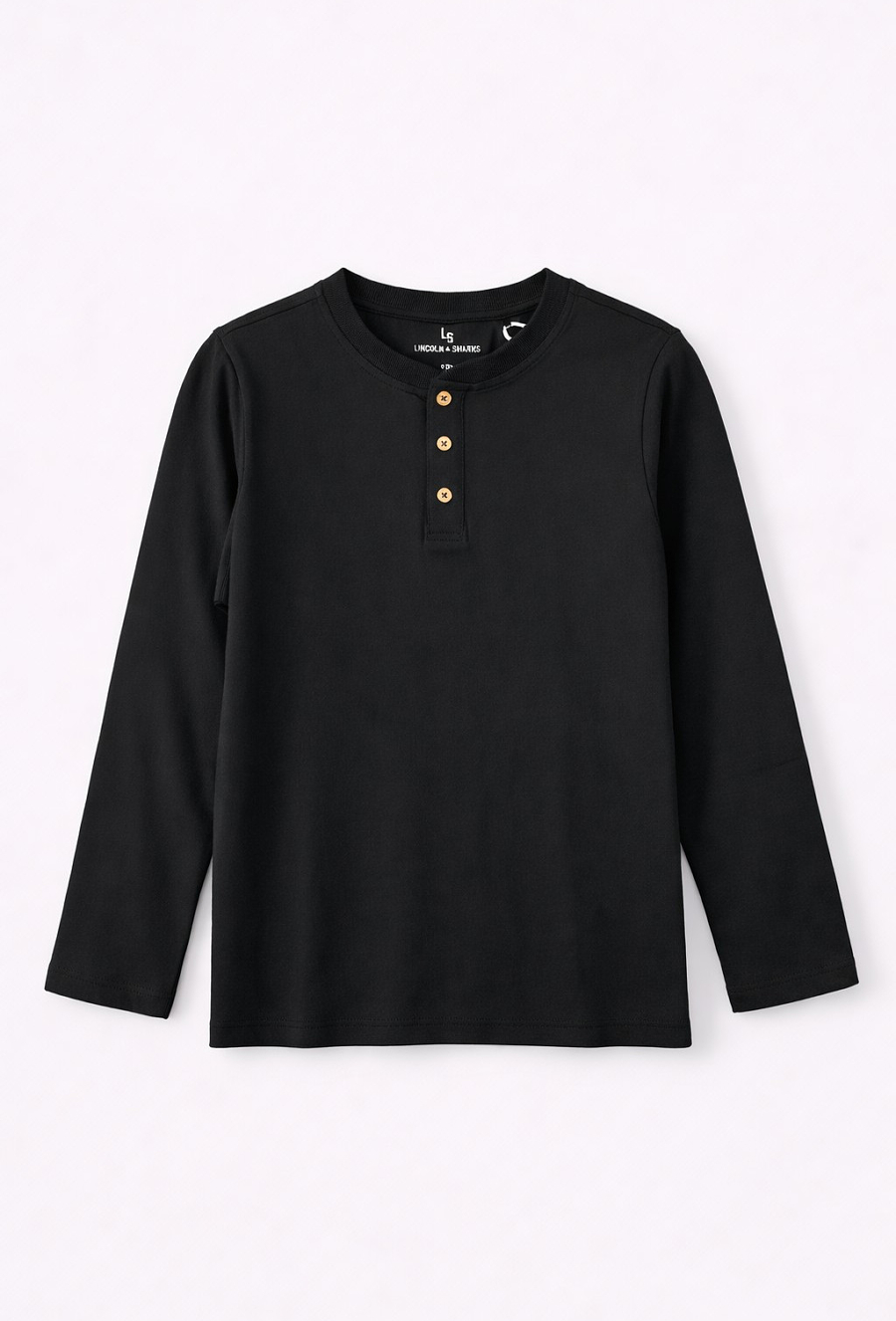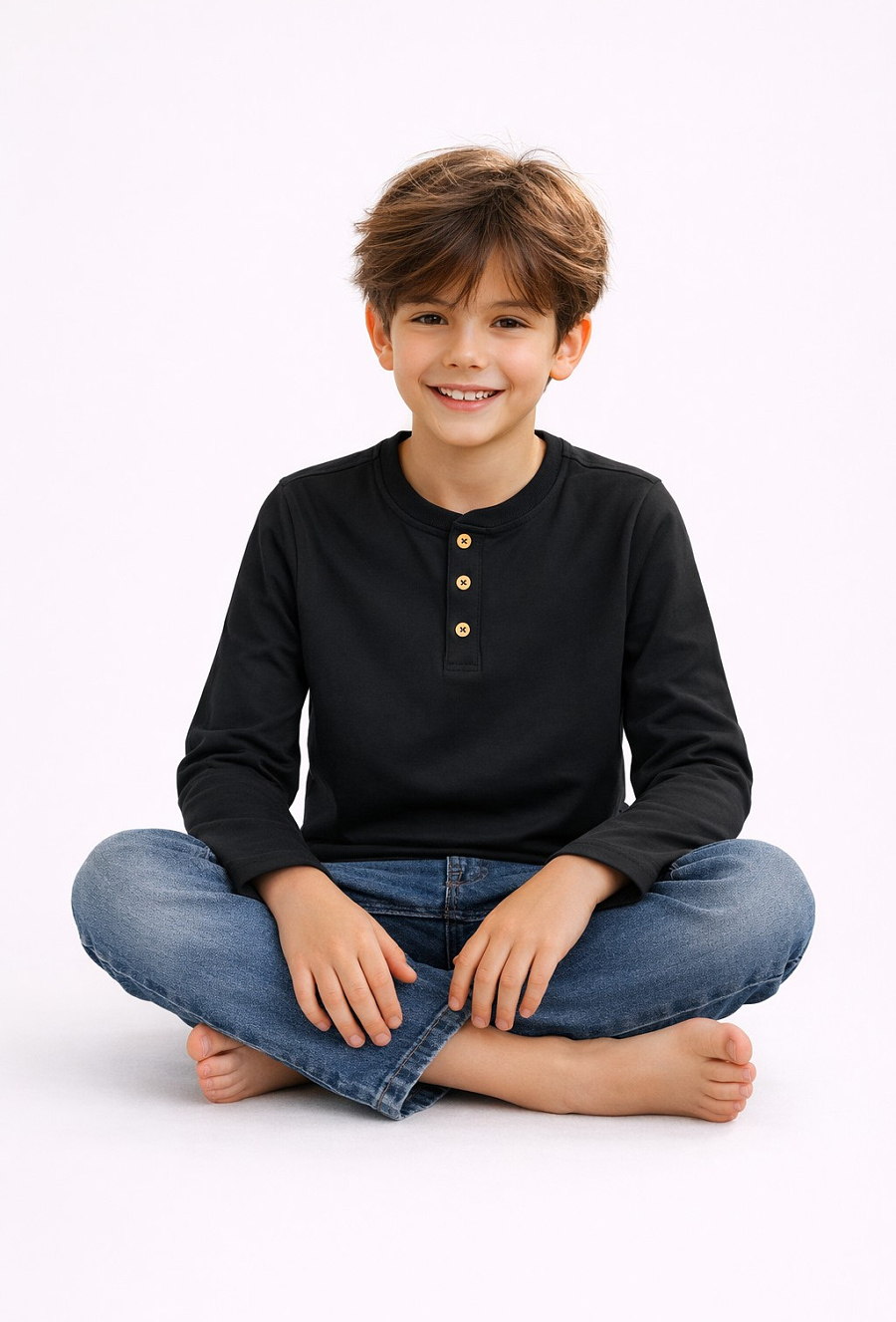 Klasyczna bluzka z długim rękawem dla dużego chłopca to uniwersalny element dziecięcej garderoby. Wykonana z miękkiej i przyjemnej w dotyku dzianiny, zapewnia komfort noszenia przez cały dzień. Prosty fason oraz ponadczasowy czarny kolor sprawiają, że bluzka doskonale sprawdzi się zarówno w codziennych stylizacjach, jak i w bardziej eleganckim zestawieniu – do szkoły, na rodzinne wyjścia czy spotkania z rówieśnikami. Dekolt z delikatnym zapięciem na guziki dodaje całości subtelnego charakteru.