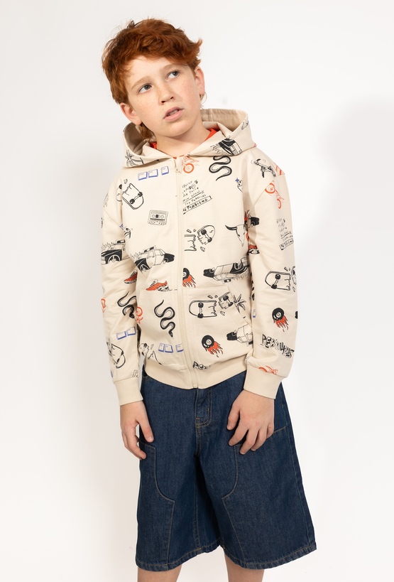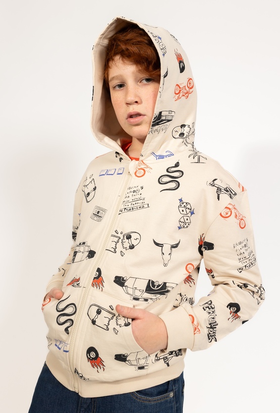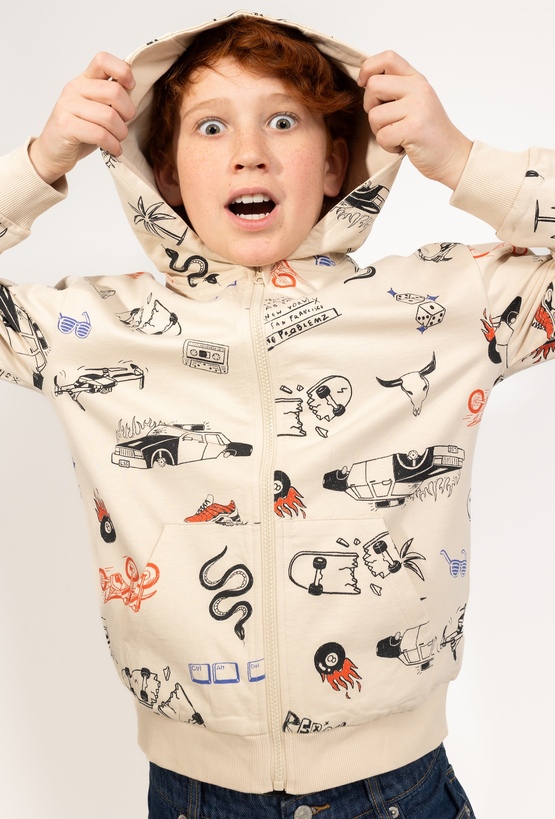 Wygodna bluza z kapturem to niezastąpiony element chłopięcej garderoby, zapewniający komfort podczas codziennych aktywności. Model został wykonany w całości z naturalnej bawełny, co gwarantuje miękkość i przyjemność noszenia. Bluza posiada praktyczne zapięcie na suwak oraz dwie kieszenie, co zwiększa jej funkcjonalność. Całość zdobi unikalny nadruk na całej powierzchni, nadający bluzie wyrazisty, młodzieżowy charakter. Dzięki krojowi typu comfort, zapewnia pełną swobodę ruchów.