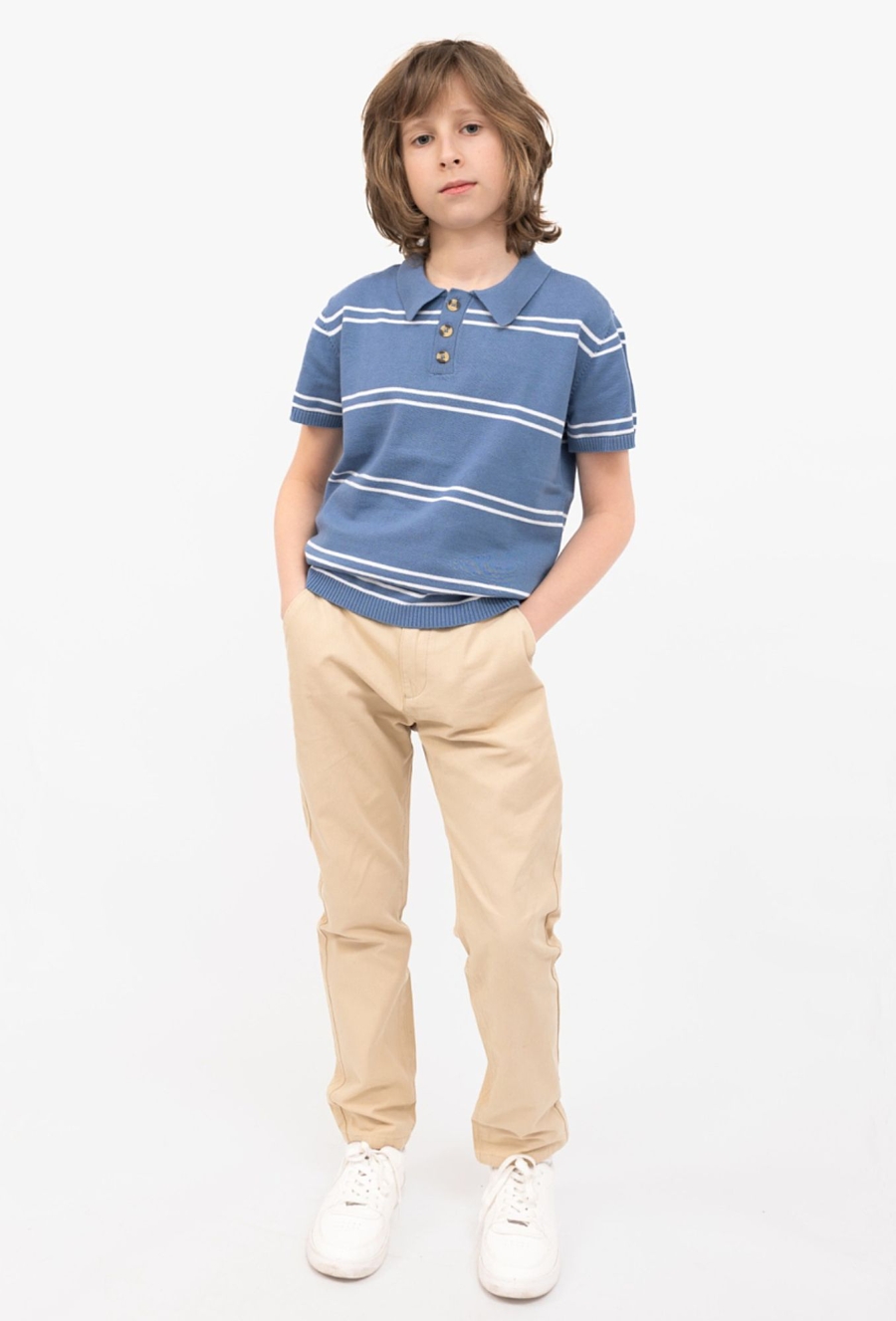 Jasne, uniwersalne i wygodne – chinosy ecru o kroju regular to sprawdzona baza wielu stylizacji. Uszyte z 100% bawełny, są przyjemne w noszeniu i świetnie sprawdzają się przez cały dzień – w szkole, na spacerze czy podczas rodzinnych wyjść. Fason regular zapewnia swobodę i klasyczny wygląd. Spodnie zapinane są na kontrastowy guzik i suwak, a wewnętrzna taśma do regulacji pozwala idealnie dopasować pas do sylwetki (praktyczne rozwiązanie, gdy dziecko szybko rośnie).