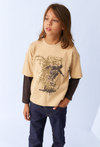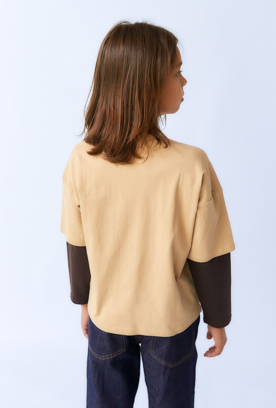 Wyróżnij się na co dzień dzięki tej modnej chłopięcej bluzce z długim rękawem z efektownym nadrukiem skejtera! Model w kolorze beżowym z wszytym ciemniejszym rękawem daje efekt dwóch warstw, dodając stylizacji luzu i charakteru. Wykonana w całości z bawełny, gwarantuje komfort noszenia oraz przewiewność. To idealny wybór do szkoły, na spotkania z przyjaciółmi czy codzienne aktywności.