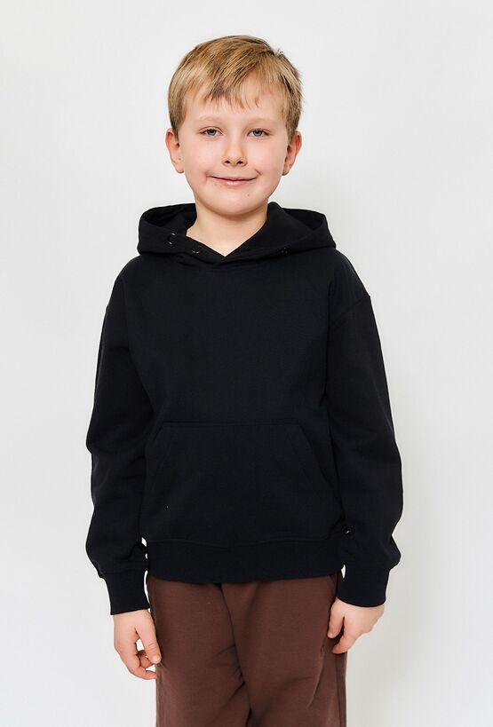Chłopięca bluza typu kangurka w uniwersalnym czarnym kolorze. Wyposażona w obszerny kaptur, praktyczną kieszeń na przodzie oraz elastyczne ściągacze przy rękawach i u dołu. Komfortowy, luźny fason zapewnia swobodę ruchów podczas zabawy oraz aktywności na świeżym powietrzu. Sprawdzi się jako praktyczne uzupełnienie każdej chłopięcej garderoby. Idealna do szkoły, na zajęcia sportowe oraz spotkania z przyjaciółmi.