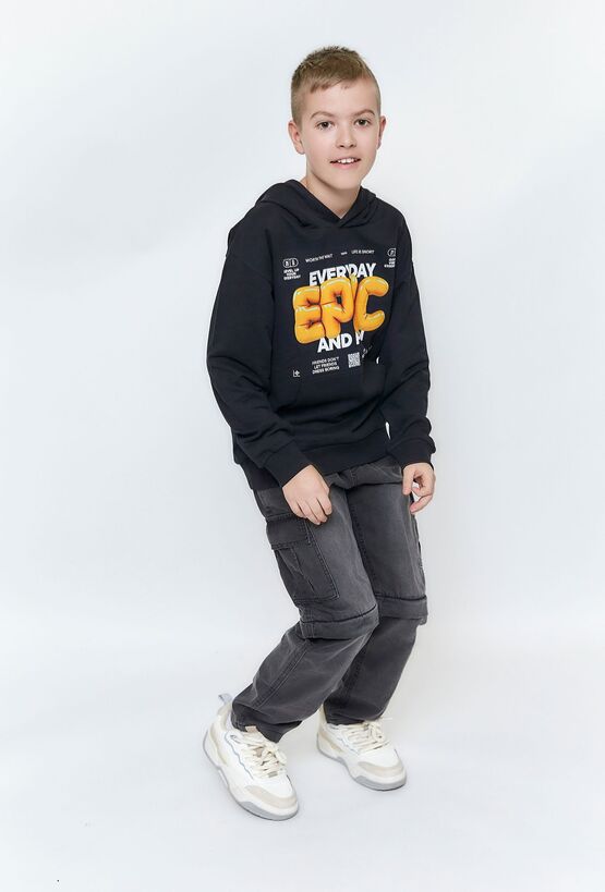 Czarna bluza z kapturem dla chłopca z przyciągającym uwagę nadrukiem w efektownym, wypukłym stylu. Wygodny fason z kieszenią typu kangurka i elastycznymi wykończeniami zapewnia komfort podczas codziennego noszenia. Miękka tkanina sprawdzi się zarówno w chłodniejsze dni, jak i jako warstwa pod kurtkę. Energetyczny nadruk dodaje charakteru, a całość wpisuje się w luźny, młodzieżowy klimat.