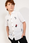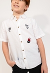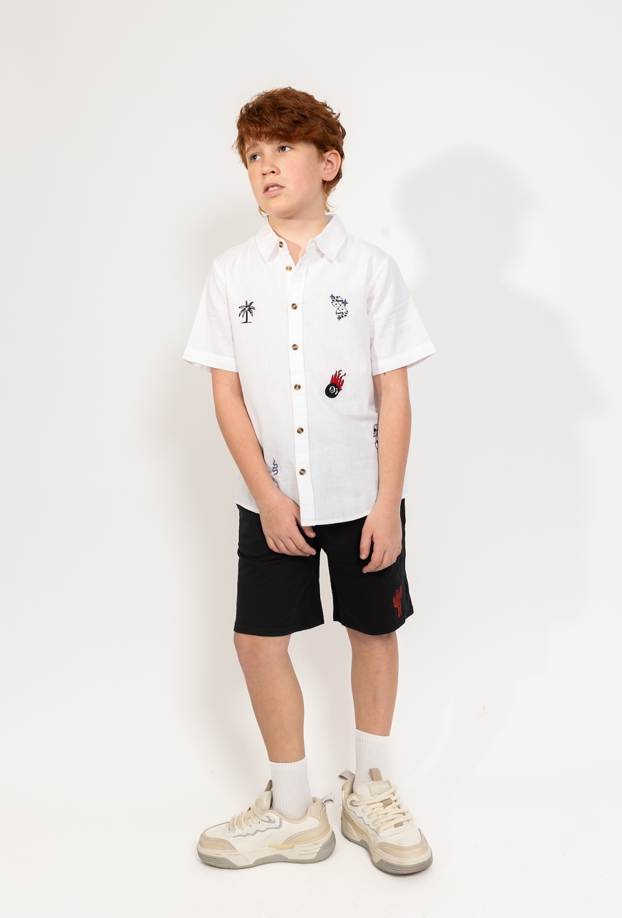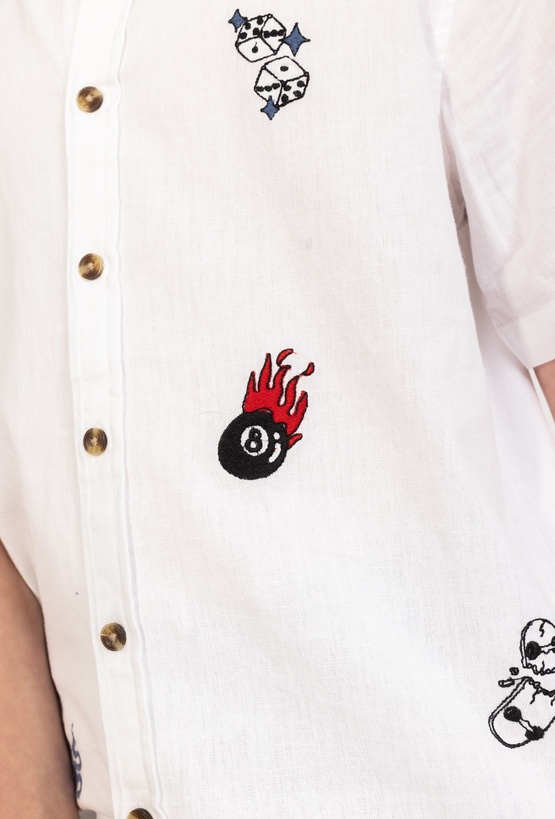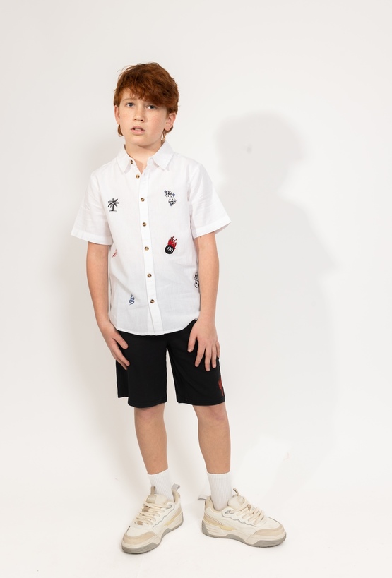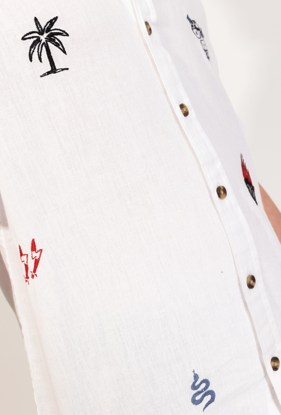 Lekka i przewiewna koszula, która łączy klasyczną elegancję z wakacyjnym luzem. Wykonana z połączenia wysokiej jakości bawełny oraz lnu, zapewnia komfort noszenia nawet podczas ciepłych dni. Model posiada krótki rękaw oraz klasyczne zapięcie na guziki. Całość ozdobiona jest kilkoma haftami w średnim rozmiarze o ciekawych, chłopięcych motywach, które nadają jej unikalnego charakteru. Starannie wykończona, stanowi świetny wybór do wielu stylizacji.