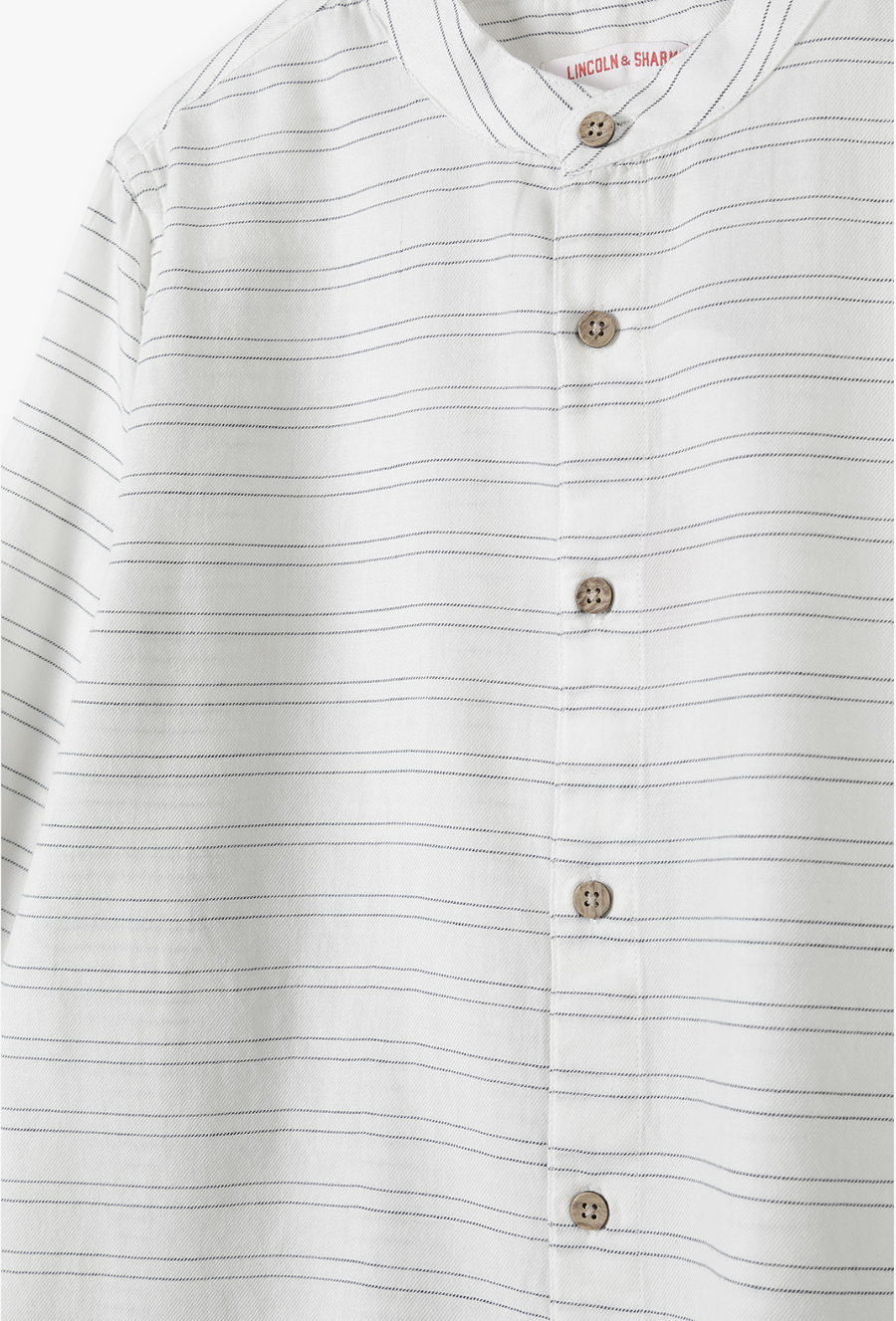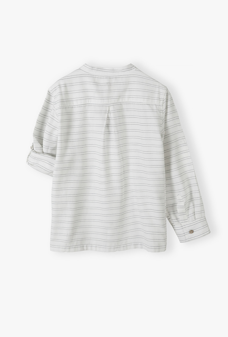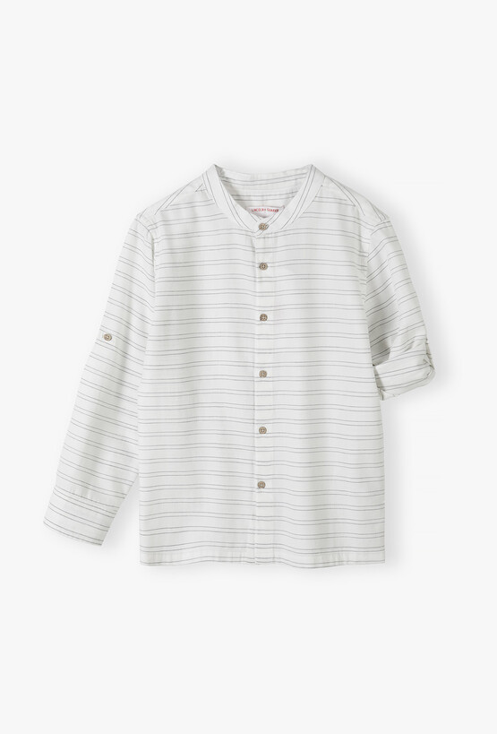 Połącz klasykę z wakacyjnym luzem! Ta biała koszula w subtelne, ciemne paski to idealny wybór dla dużego chłopca, który chce wyglądać elegancko, ale czuć się swobodnie. Zamiast tradycyjnego kołnierzyka postawiliśmy na modną stójkę, która nadaje całości nowoczesnego, nieco mniej formalnego charakteru. Niska stójka zamiast kołnierzyka to jeden z najsilniejszych trendów. Wygląda świetnie zarówno podpięta pod szyję, jak i rozpięta w luźniejszym stylu. Koszula ze stójką fantastycznie komponuje się z beżowymi lub granatowymi chinosami, a w cieplejsze dni – z lnianymi szortami. To ubranie, które sprawdzi się zarówno na rodzinnym obiedzie, jak i podczas wakacyjnego spaceru.