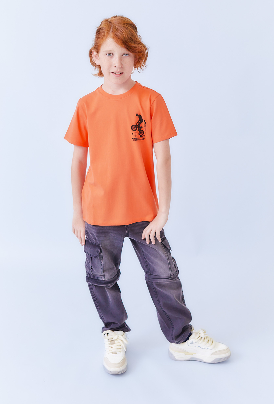 Energetyczna pomarańczowa koszulka chłopięca z małym, minimalistycznym nadrukiem. Prosty, wygodny krój sprawdzi się zarówno na co dzień, jak i podczas aktywności na świeżym powietrzu. Wykonana w 100% z miękkiej bawełny, zapewnia komfort noszenia i swobodę ruchów. Świetnie komponuje się z jeansami, joggerami czy szortami, tworząc modny i wygodny zestaw dla chłopca. Idealna dla małych fanów sportowego, casualowego stylu.