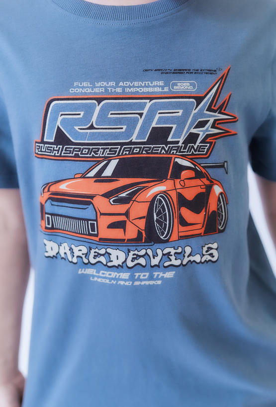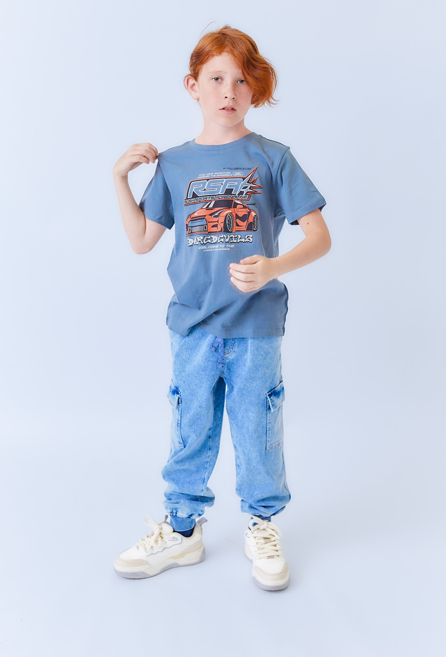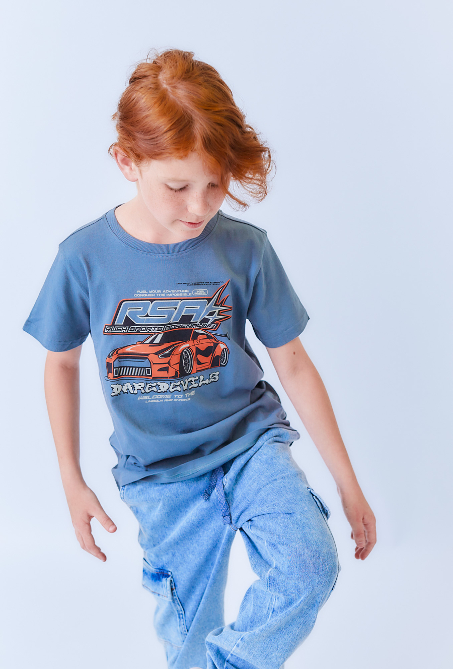 Chłopięca koszulka z krótkim rękawem w odcieniu szaro-niebieskim to must-have dla każdego małego fana motoryzacji. Na froncie znajduje się wyrazisty nadruk sportowego auta z napisem, co nadaje stylizacji dynamicznego, miejskiego charakteru. Wykonana w 100% z bawełny – miękka i oddychająca tkanina zapewnia komfort noszenia nawet przez cały dzień. Koszulka doskonale pasuje do jeansów, dresów czy szortów. Idealna na co dzień, do szkoły lub na weekendowe wypady.