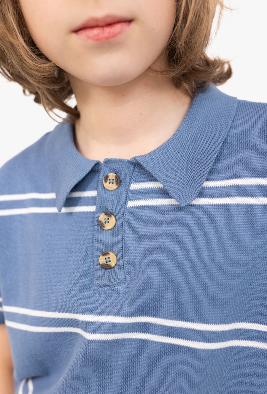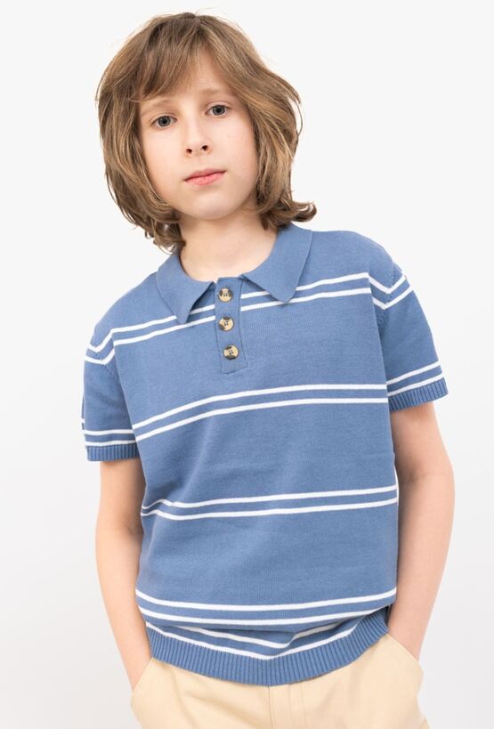 Chłopięca koszulka polo z dzianiny swetrowej w kolorze niebieskim z nieregularnymi, białymi paskami. Uszyta z 100% bawełny, jest miękka, przewiewna i wygodna w noszeniu. Model ma krótki rękaw oraz dekolt zapinany na kontrastowe guziki, co dodaje całości eleganckiego, ale nadal codziennego charakteru. Idealna do chinosów, szortów lub jeansów.