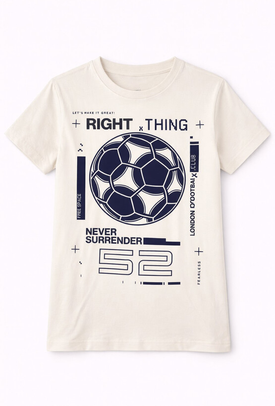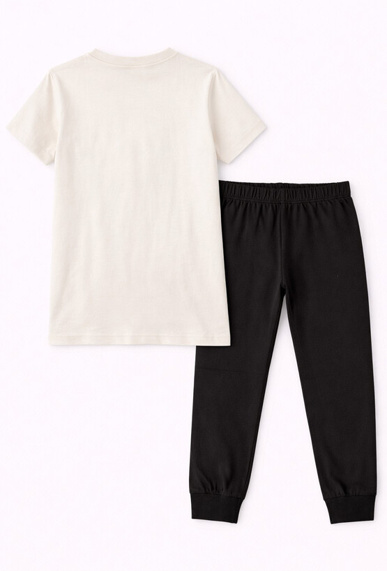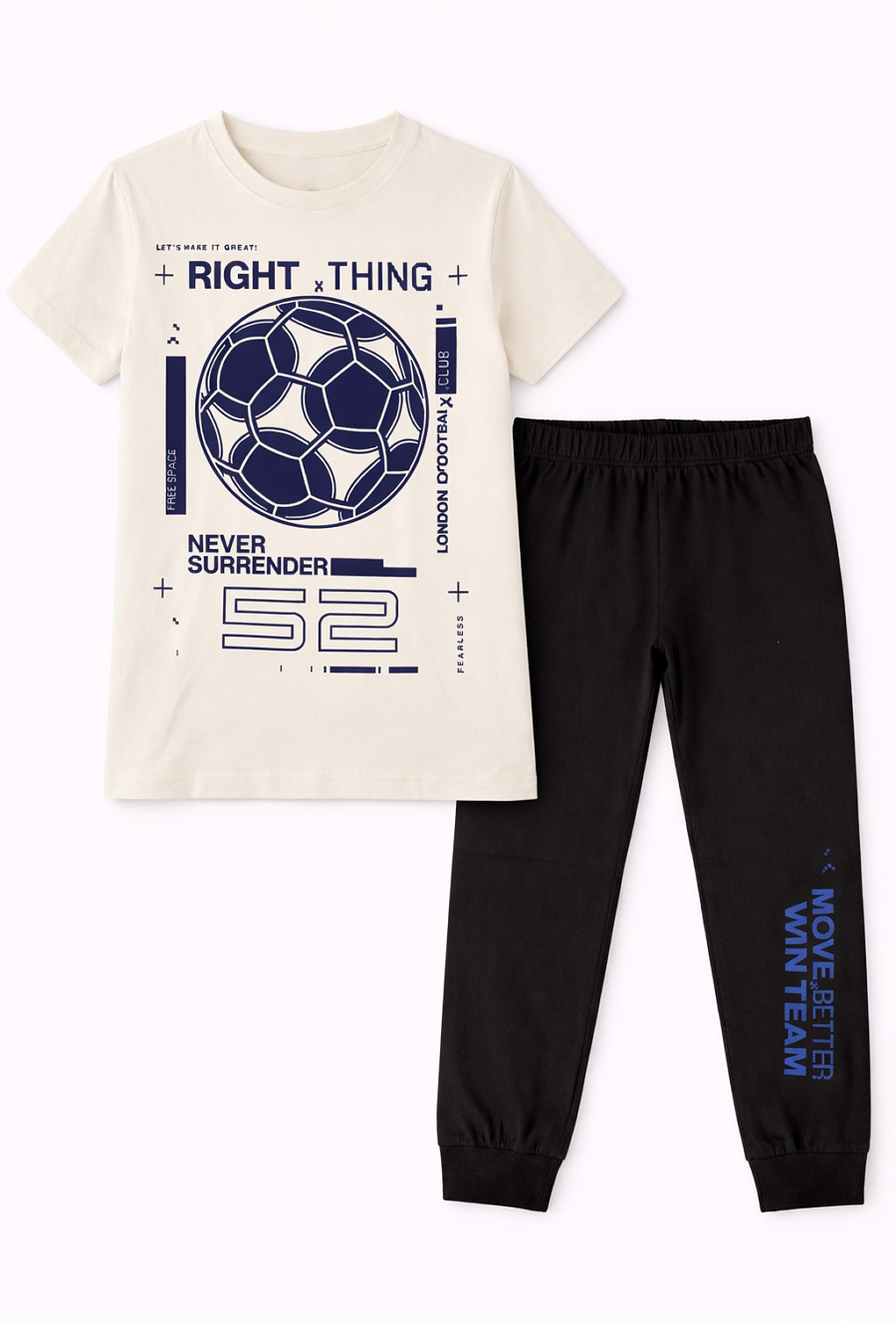 Zapewnij swojemu dziecku komfortowy sen w mistrzowskim stylu dzięki temu wyjątkowemu kompletowi piżamowemu. Piżama gwarantuje pełną swobodę ruchów i doskonałe samopoczucie przez całą noc. Koszulka z okrągłym dekoltem. Przód zdobi duży, granatowy nadruk z motywem piłki nożnej oraz inspirującymi hasłami: „RIGHT THING”, „NEVER SURRENDER” oraz numerem 52. Dynamiczna grafika z pewnością spodoba się każdemu młodemu sportowcowi. Klasyczne, czarne spodnie piżamowe o kroju typu jogger. Posiadają elastyczny pas, który nie uciska brzuszka, oraz nogawki zakończone szerokimi ściągaczami, zapobiegającymi podwijaniu się materiału w nocy. Na dole nogawki znajduje się niebieski, pionowy napis „MOVE BETTER WIN TEAM”, nawiązujący do sportowego charakteru góry.