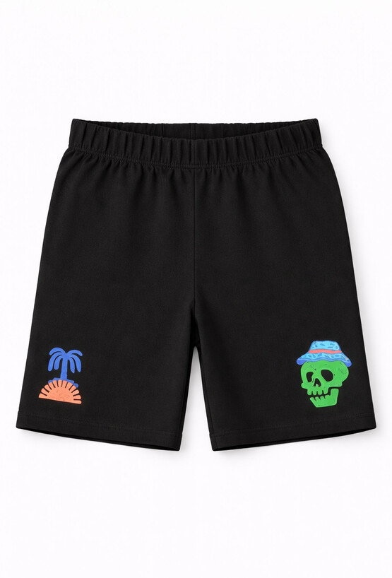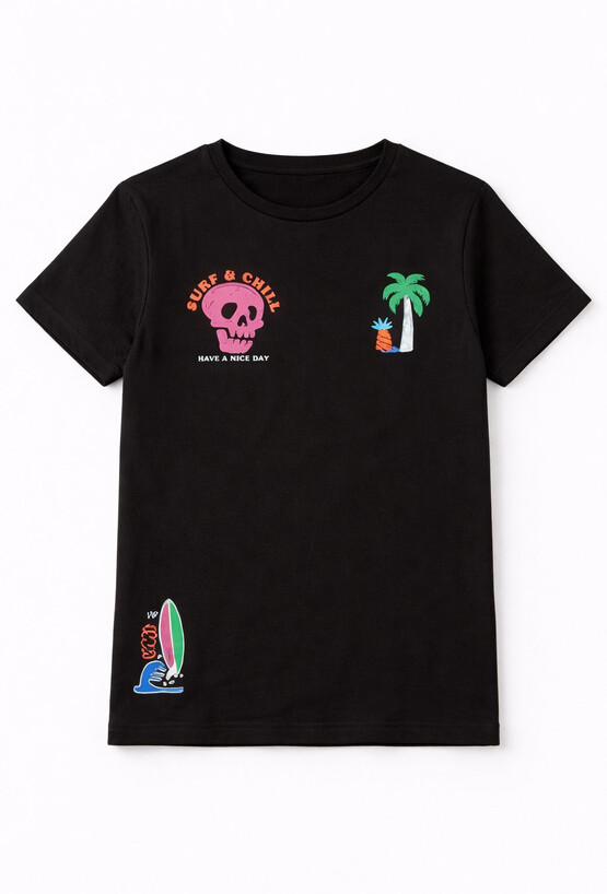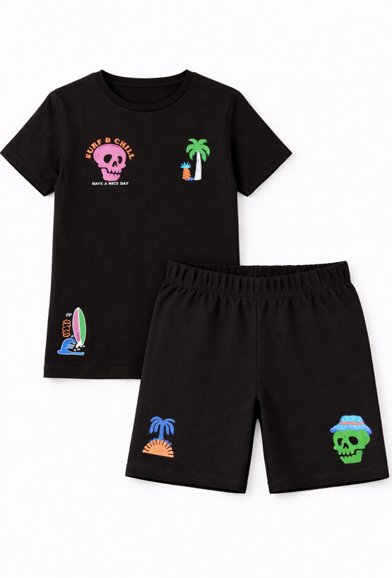 Zapewnij swojemu dziecku wygodny sen i modny wygląd dzięki temu wyjątkowemu kompletowi piżamowemu. Klasyczna czarna koszulka z okrągłym dekoltem. Przód zdobią radosne, neonowe grafiki: różowa czaszka z napisem „SURF & CHILL – HAVE A NICE DAY”, palma oraz deska surfingowa na fali. Kontrastowe kolory nadruków świetnie wyróżniają się na ciemnym tle. Wygodne krótkie spodenki w jednolitym czarnym kolorze, dopasowane do koszulki. Posiadają elastyczny pas, który zapewnia komfort noszenia bez uciskania. Na nogawkach umieszczono pasujące motywy graficzne – palmę oraz zieloną czaszkę w kapeluszu.