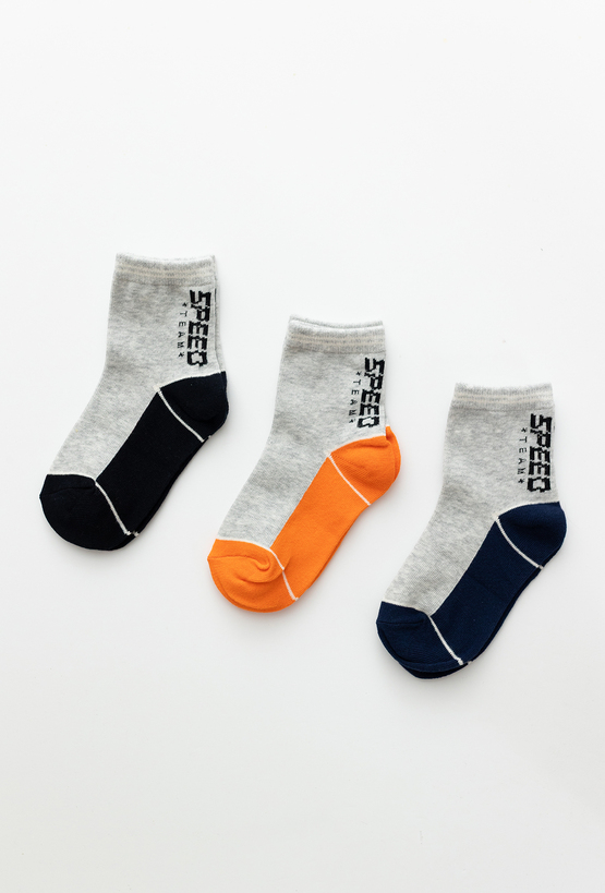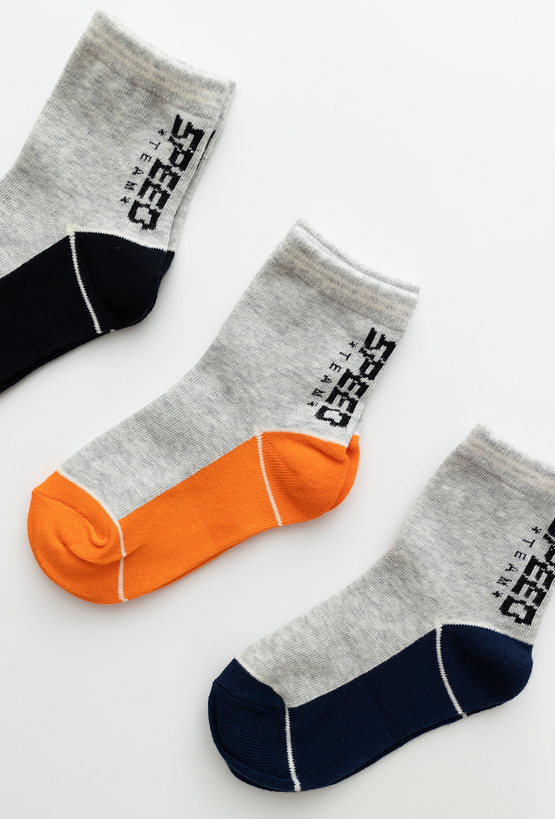 Zestaw 3 par chłopięcych skarpet w kolorze szarym z kontrastowymi stopami w odcieniach granatu, pomarańczowym i czerni. Wykonane z wysokiej jakości bawełny (80%) z dodatkiem poliamidu i elastanu, co zapewnia trwałość, komfort noszenia i odpowiednią elastyczność. Sportowy nadruk „SPEED TEAM” dodaje im charakteru. Idealne do codziennego użytku – do szkoły, zabawy i aktywności na świeżym powietrzu.