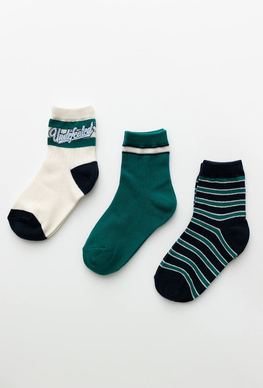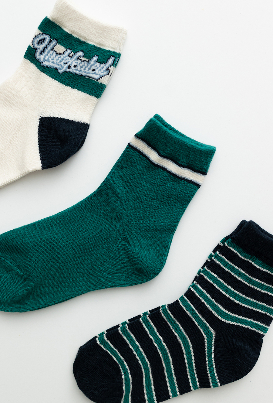 Zestaw 3 par skarpet chłopięcych w odcieniach zieleni, bieli i granatu. Wykonane z wysokiej jakości bawełny (80%) z domieszką poliamidu i elastanu, co zapewnia trwałość, wygodę i elastyczność. Wzory obejmują klasyczne paski, jednolity kolor oraz sportowy nadruk, dzięki czemu pasują do różnych stylizacji. Idealne do codziennego noszenia – do szkoły, przedszkola czy na spacer.