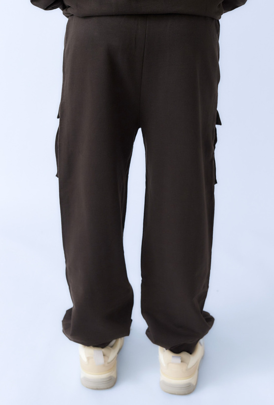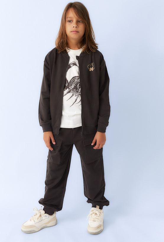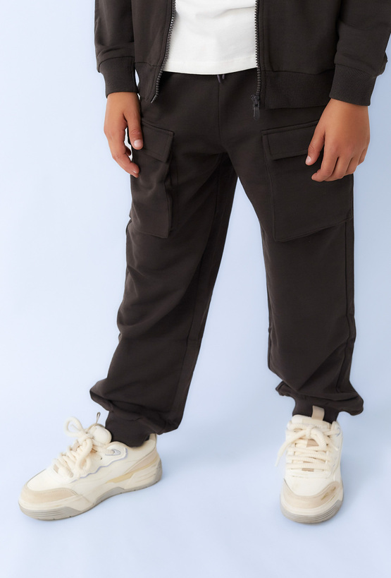 Nowoczesne spodnie dresowe chłopięce w fasonie bojówek. Wykonane z dzianiny bawełnianej, są miękkie, przewiewne i przyjemne w dotyku. Model posiada praktyczne kieszenie cargo, elastyczny pas z troczkiem i ściągacze przy nogawkach, które zapewniają idealne dopasowanie. Uniwersalny, ciemny kolor świetnie sprawdzi się w codziennych stylizacjach — zarówno do szkoły, jak i na weekendowe wyjścia. Idealne dla aktywnych chłopców, którzy cenią sobie luz, komfort i modny wygląd.