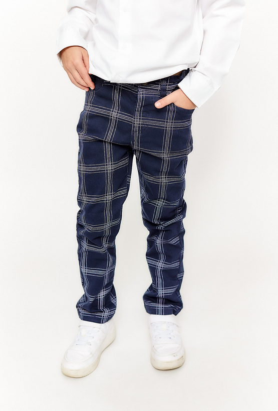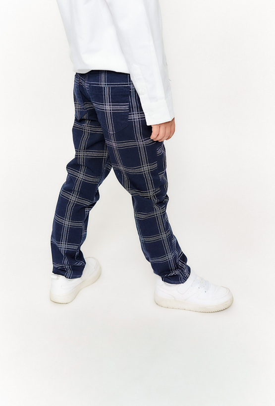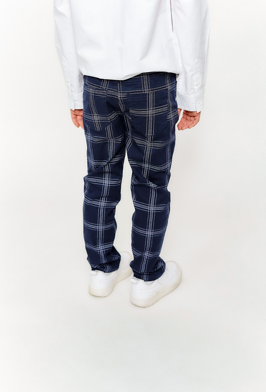 Eleganckie spodnie klasyczne dla chłopca w granatowym kolorze z modnym wzorem w kratę to świetna propozycja zarówno na wyjątkowe okazje, jak i na co dzień. Wykonane z wysokiej jakości tkaniny: 98% bawełna, 2% elastan – zapewniają wygodę i swobodę ruchów. Klasyczny krój z kieszeniami i zapięciem na guzik idealnie komponuje się z koszulą lub swetrem. Świetny wybór na rodzinne uroczystości, szkolne akademie czy stylowe codzienne outfity.