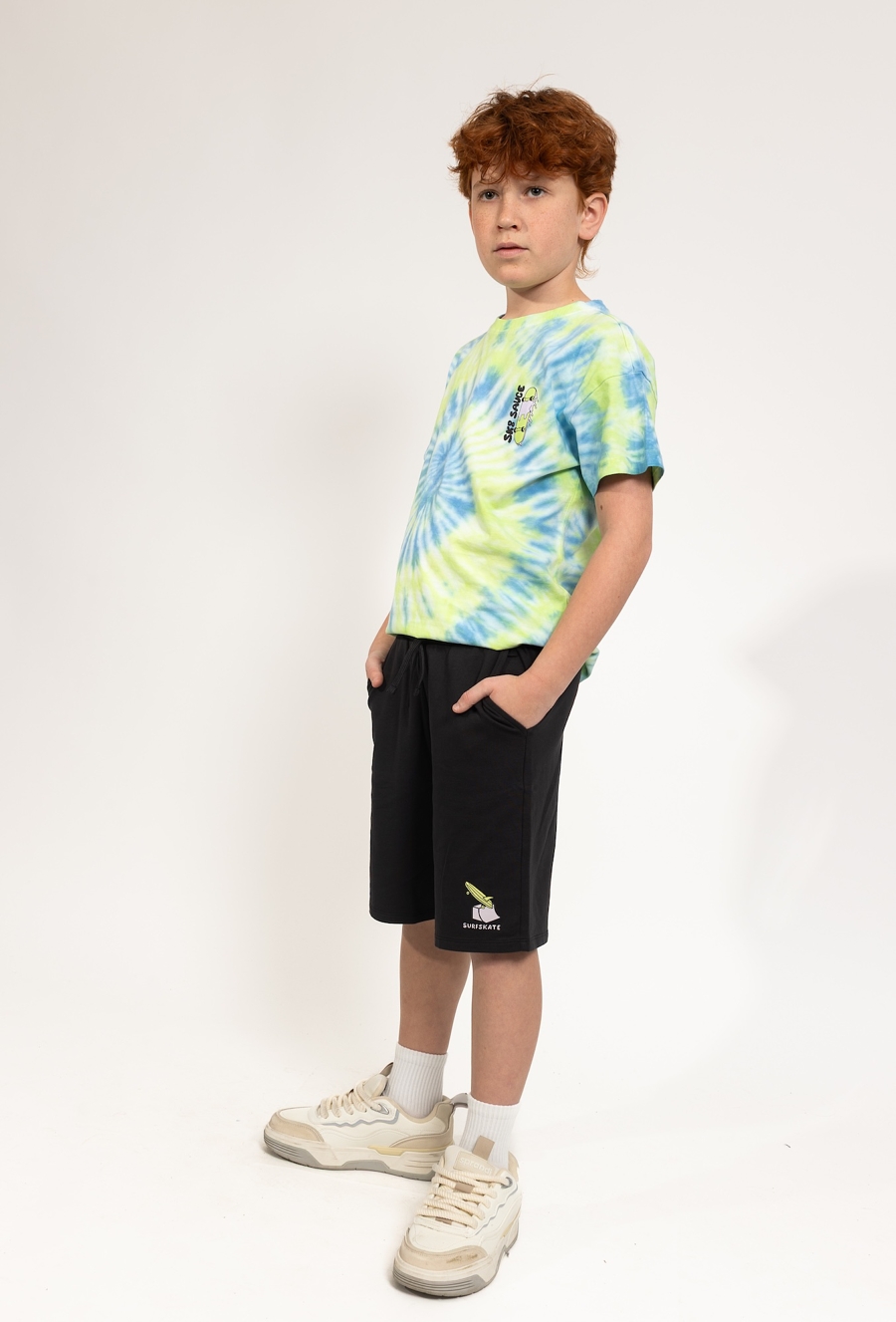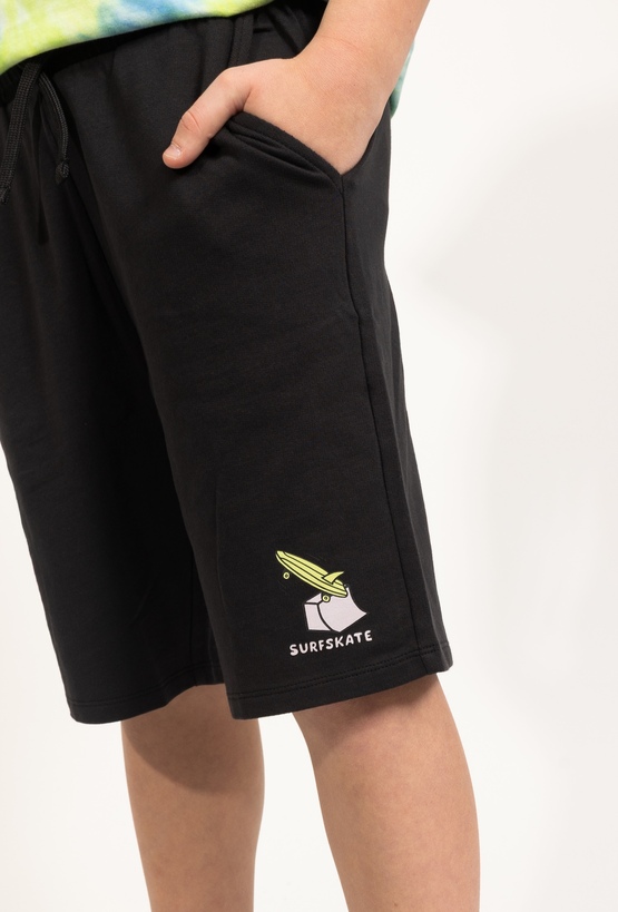 Te czarne szorty to idealna propozycja dla aktywnych chłopców, którzy cenią sobie wygodę i modny, luźny styl. Wykonane z miękkiej i przyjemnej w dotyku dzianiny, zapewniają pełen komfort noszenia oraz swobodę ruchów, co czyni je doskonałym wyborem na co dzień, do zabawy czy letnich aktywności na zewnątrz. Model wyróżnia się nowoczesnym, przyciągającym wzrok nadrukiem, który przedstawia deskę oraz napis „SURFSKATE” umieszczony na nogawce. To połączenie nadaje całości wakacyjnego, miejskiego charakteru. Szorty posiadają elastyczny pas z praktycznym sznurkiem do regulacji, co pozwala na idealne dopasowanie do sylwetki dziecka. To wszechstronny element garderoby, który świetnie komponuje się z ulubionymi t-shirtami, tworząc gotowy, stylowy look.
