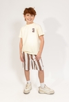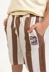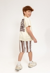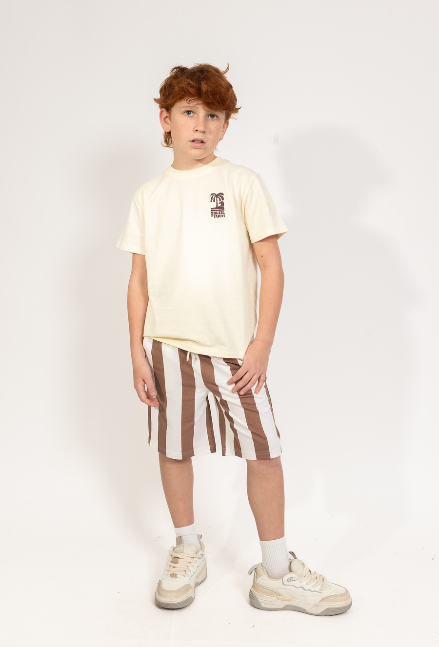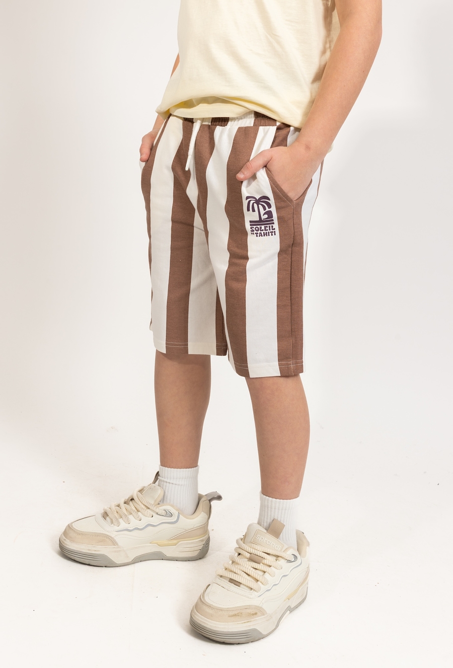 Te chłopięce szorty to idealne połączenie wakacyjnego designu i bezkompromisowej wygody. Wykonane z miękkiej i przewiewnej dzianiny dresowej, gwarantują pełną swobodę ruchów oraz komfort noszenia nawet podczas najbardziej intensywnych letnich zabaw. Model przyciąga wzrok klasycznym wzorem w szerokie, pionowe brązowo-białe pasy, które nadają stylizacji świeżości. Na lewej nogawce umieszczono charakterystyczną dla tej linii grafikę z palmą oraz napisem „SOLEIL DE TAHITI”, co podkreśla letni, tropikalny charakter ubrania. Spodenki posiadają praktyczny, elastyczny pas z białym sznurkiem do regulacji, co pozwala na ich idealne dopasowanie do sylwetki dziecka. Funkcjonalności dodają wygodne, boczne kieszenie, idealne na drobne znaleziska z wakacyjnych spacerów.