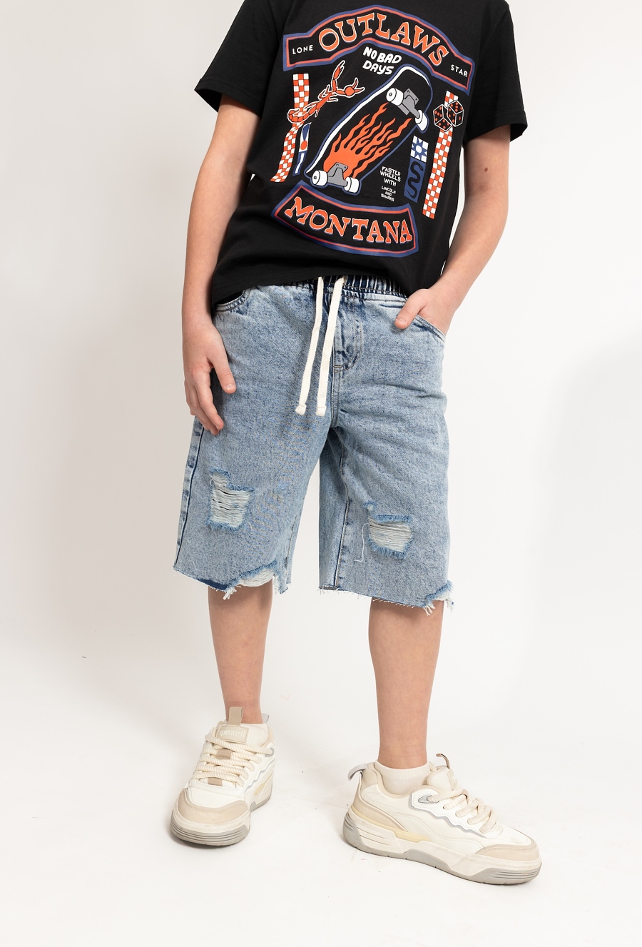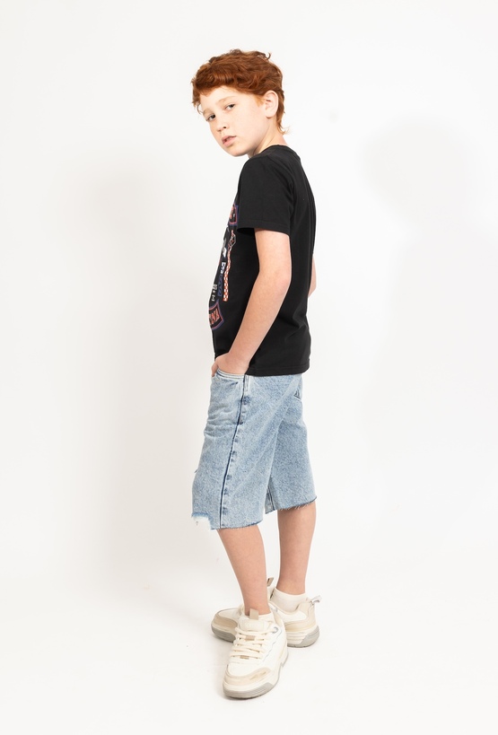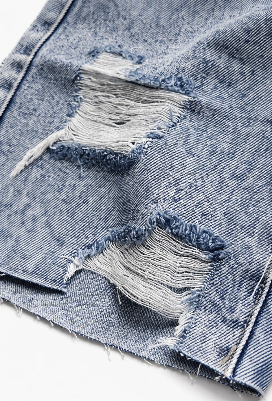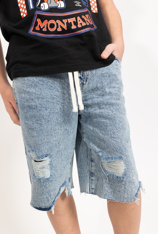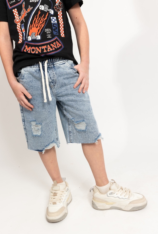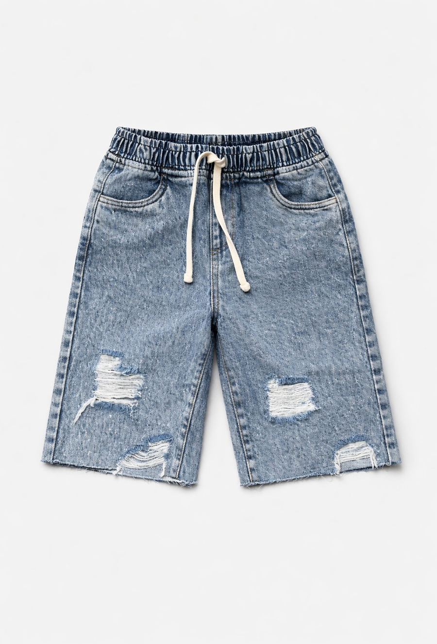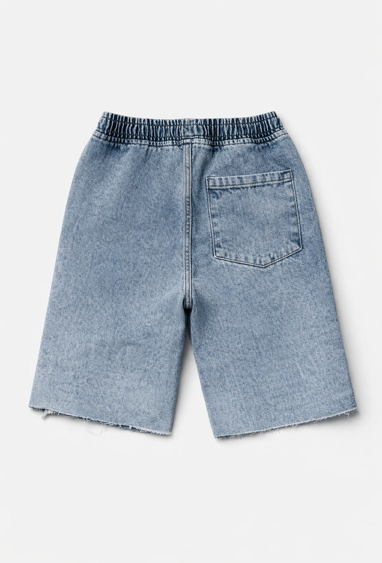 Klasyczny styl w wakacyjnym wydaniu. Te niebieskie szorty jeansowe wykonane z jasnego denimu to doskonały wybór na cieplejsze dni. Wykonane w 100% z bawełny, zapewniają przewiewność i komfort podczas każdej aktywności. Dzięki dodatkowej regulacji w pasie łatwo dopasujesz je do sylwetki dziecka, a modne, poszarpane brzegi nogawek nadają całości nowoczesnego, nieco nonszalanckiego wyglądu.