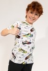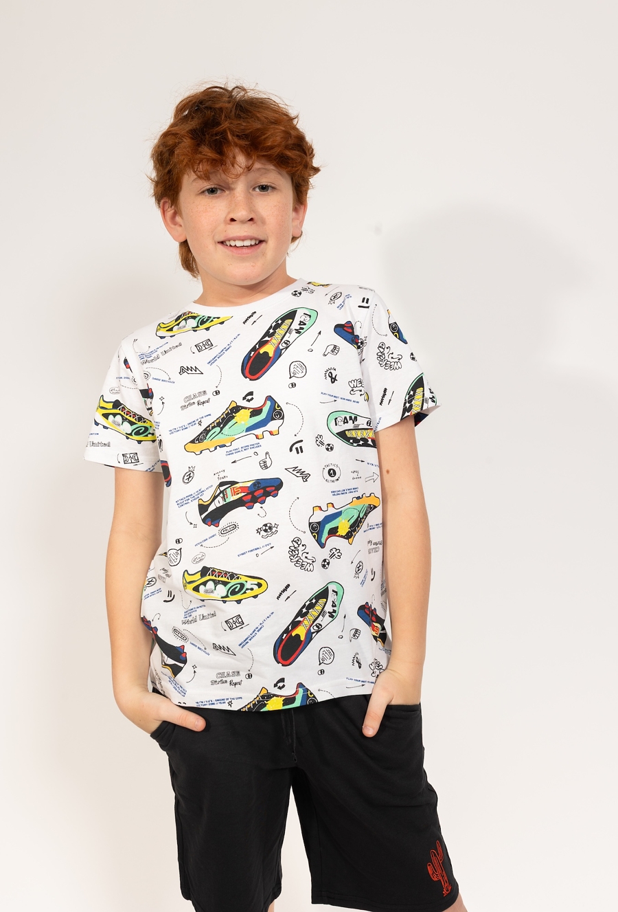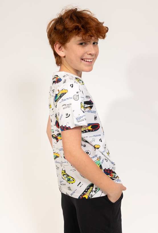 Ta biała koszulka to doskonała propozycja dla chłopców, których największą pasją jest futbol. Model posiada klasyczny, regularny krój, który zapewnia pełną swobodę ruchów i wygodę podczas codziennych aktywności, treningów czy beztroskiej zabawy na podwórku. Koszulka wyróżnia się wyrazistym, wielokolorowym nadrukiem przedstawiającym różne modele butów piłkarskich (korków) oraz drobne, sportowe grafiki, które nadają jej unikalnego, piłkarskiego charakteru. To idealna baza do sportowych stylizacji, która świetnie komponuje się z szortami czy jeansami.