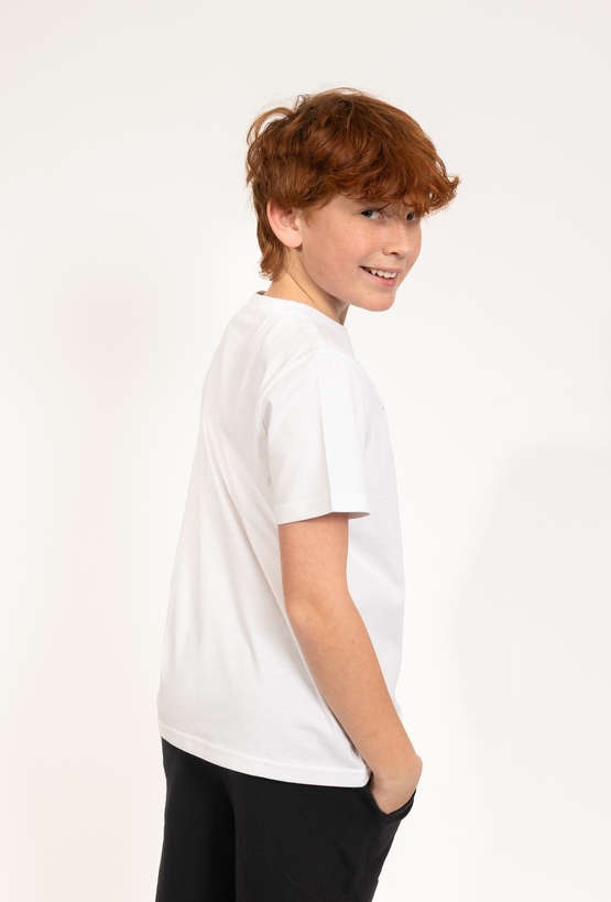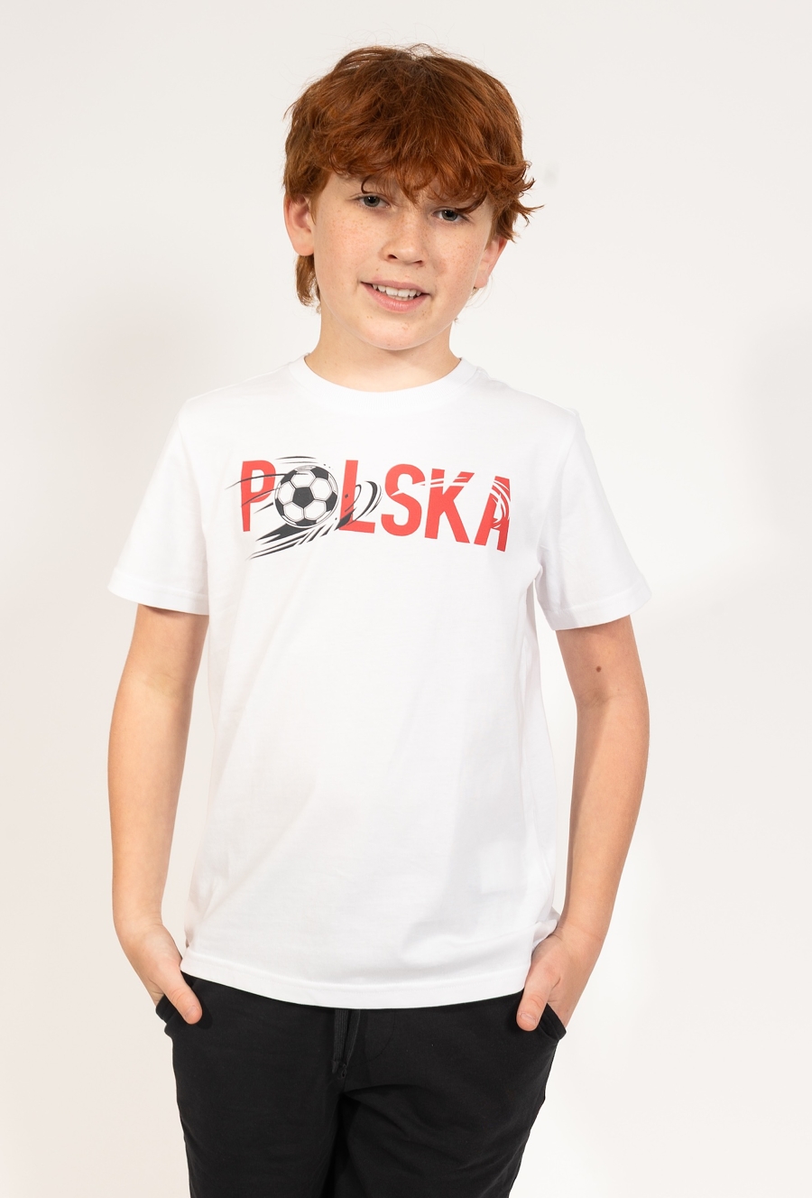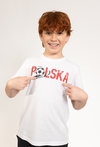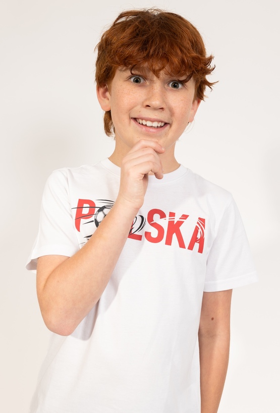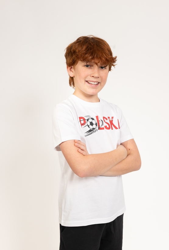 Ta klasyczna biała koszulka to doskonały wybór dla każdego małego fana sportu. Model posiada regularny krój, który zapewnia pełną wygodę podczas codziennych aktywności, zabawy czy treningów na podwórku. Na przodzie koszulki znajduje się dynamiczny nadruk przedstawiający piłkę oraz duży czerwoni napis Polska, co nadaje ubranku sportowego charakteru. Wykonana z dbałością o komfort, koszulka będzie świetną bazą do wielu chłopięcych stylizacji – doskonale pasuje do sportowych szortów czy klasycznych jeansów.