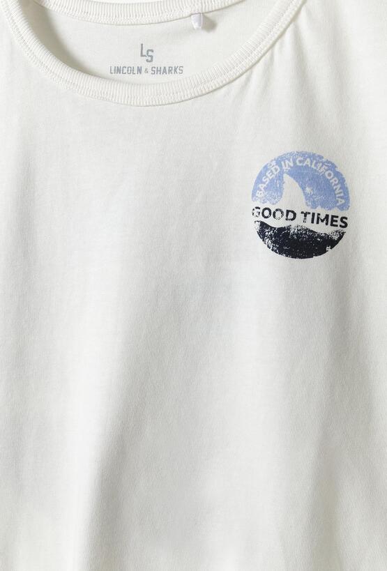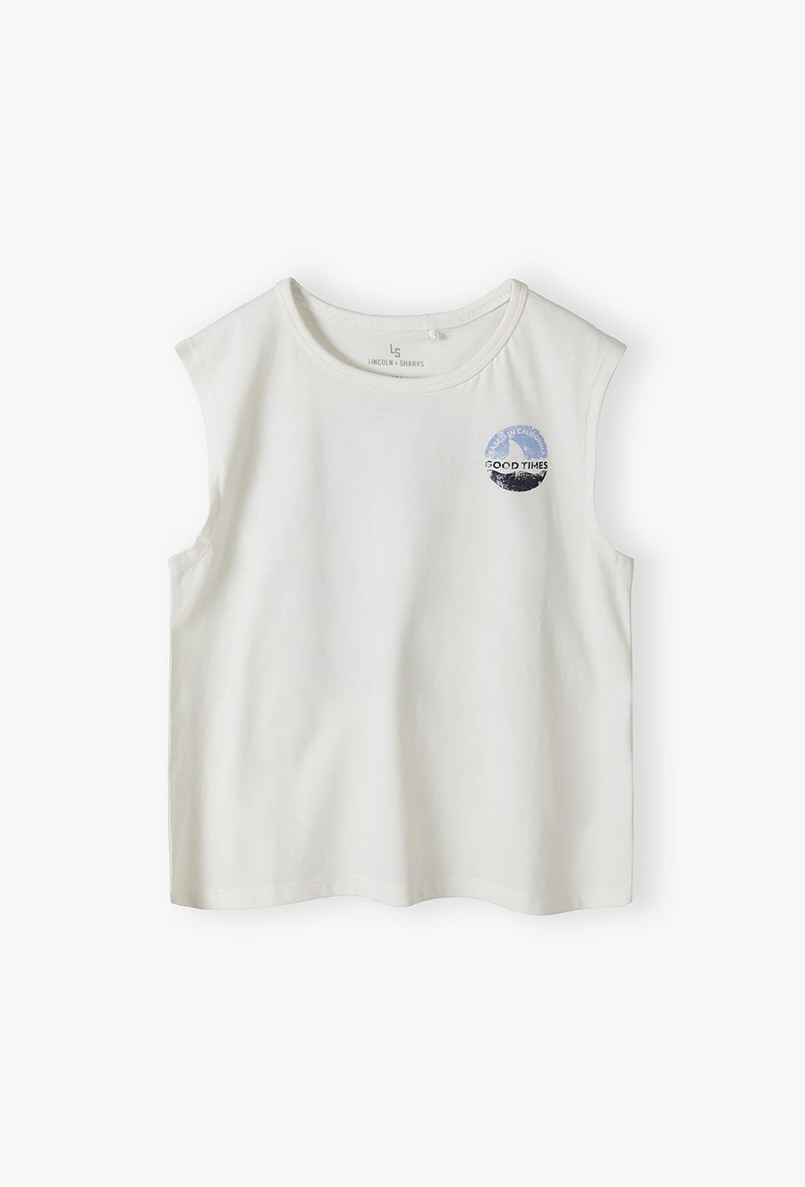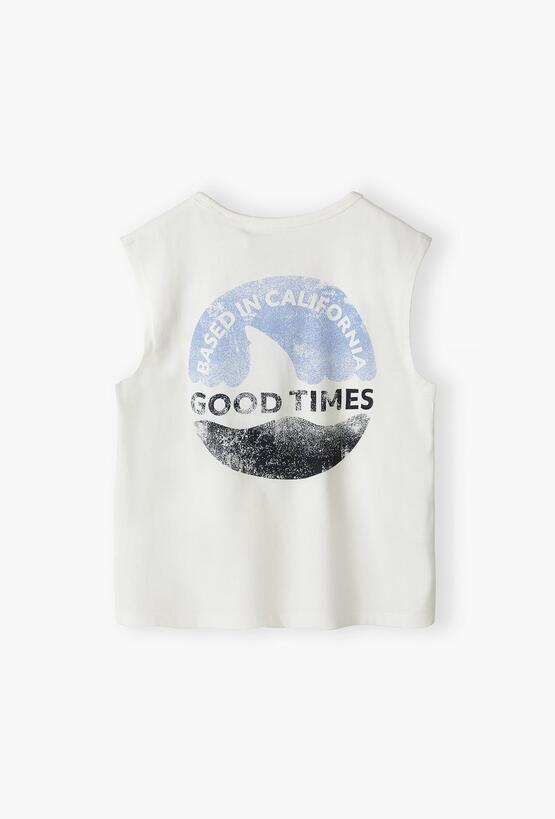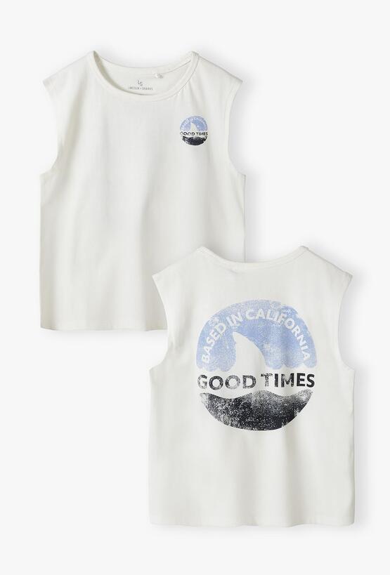 Poczuj klimat kalifornijskiego lata! Ta biała koszulka bez rękawów to idealny wybór na upalne dni, wakacyjne wyjazdy i czas spędzony nad wodą. Dzięki swobodnemu krojowi i dynamicznej grafice, tank top ten zapewni Twojemu synowi maksymalny komfort i modny, surferski wygląd. Na plecach znajduje się duża, okrągła grafika w stylu vintage przedstawiająca płetwę rekina na tle fal. Napis „BASED IN CALIFORNIA” oraz „GOOD TIMES” nadają koszulce autentycznego, wakacyjnego charakteru. Mniejsza wersja tego samego logotypu zdobi przód. Klasyczny krój typu tank top z szerokimi wycięciami pod pachami gwarantuje nieograniczoną swobodę ruchów i doskonałą wentylację w najwyższych temperaturach.