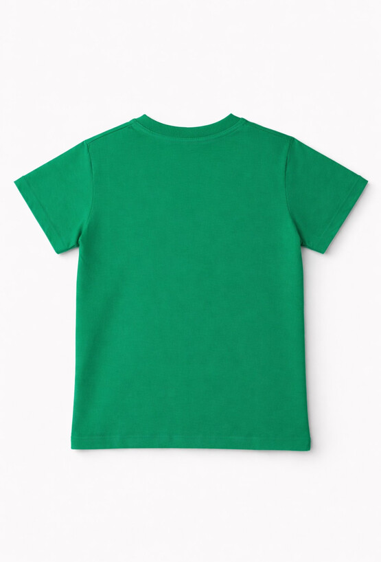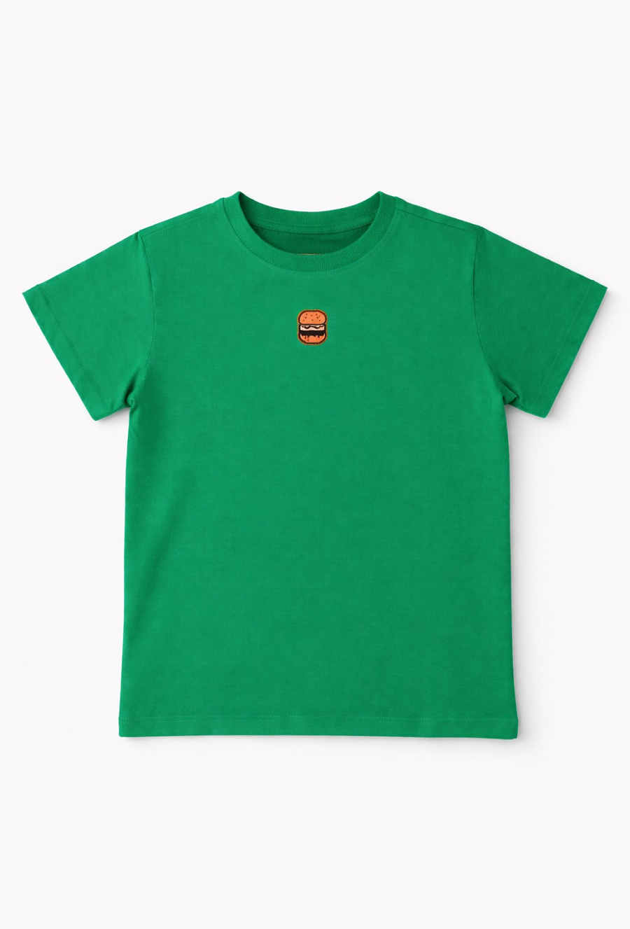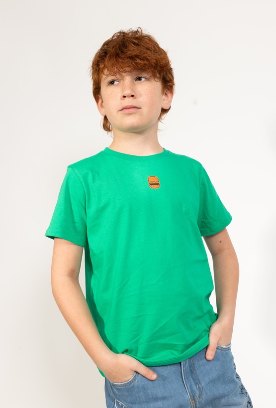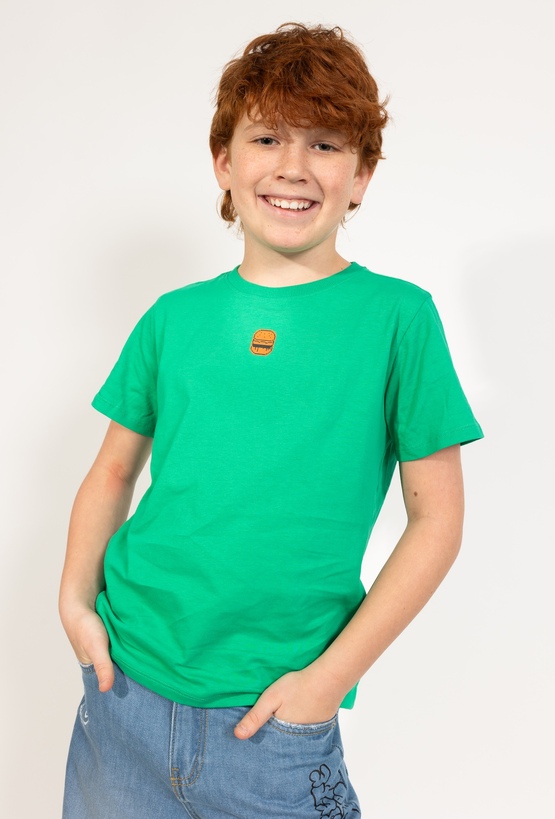 Zielona koszulka dla chłopca typu T-shirt z uroczym motywem burgera to prosty, wygodny klasyk do codziennych stylizacji. Wykonana w 100% z bawełny, jest miękka i przyjemna dla skóry. Krój regular dobrze leży, nie krępuje ruchów i świetnie sprawdza się zarówno w szkole, jak i podczas aktywnej zabawy. Mały print na piersi dodaje charakteru, ale pozostaje uniwersalny.