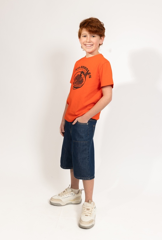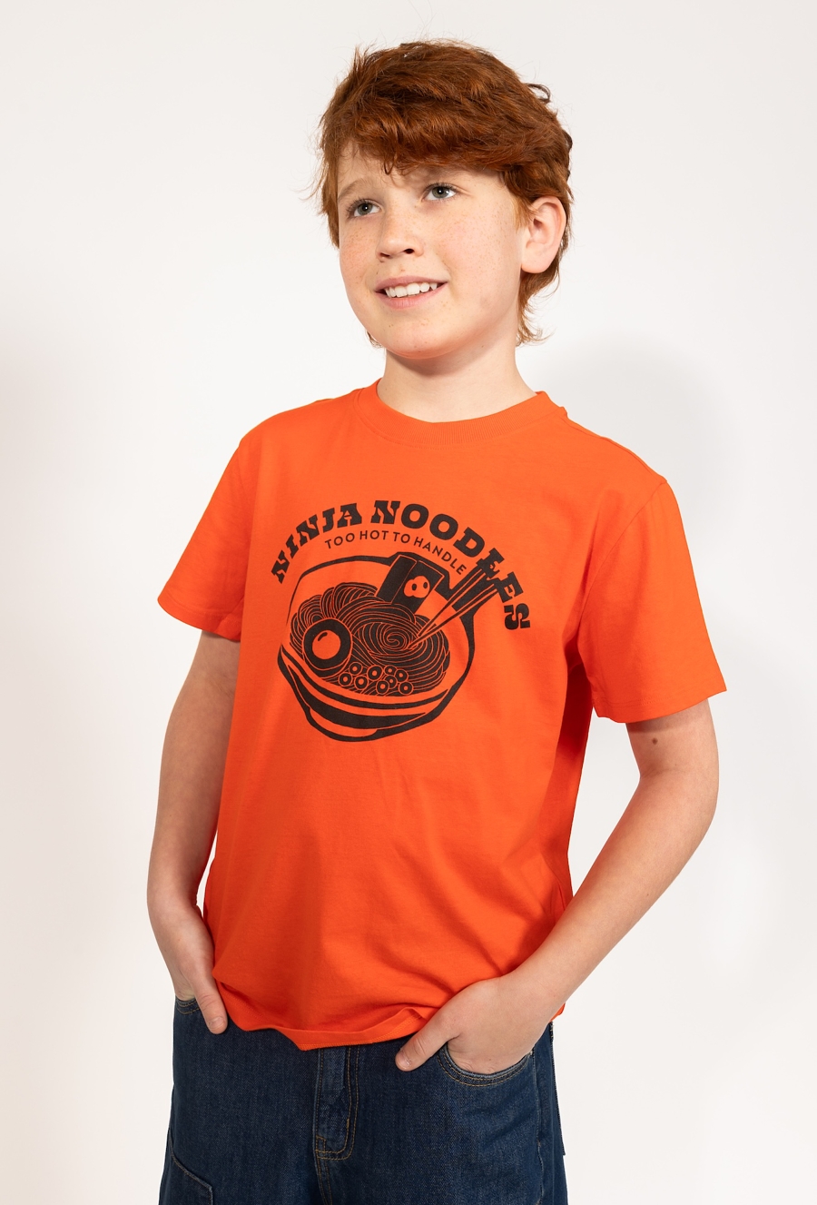 Czerwona koszulka dla chłopca z wyrazistym nadrukiem z motywem ramenu i napisem „Ninja Noodles” to świetny wybór dla fanów zabawnych printów. Uszyta w 100% z bawełny, jest miękka, przewiewna i komfortowa w noszeniu. Fason regular zapewnia swobodę ruchów, a intensywny kolor dodaje energii każdej stylizacji – pasuje do jeansów, szortów i dresów.